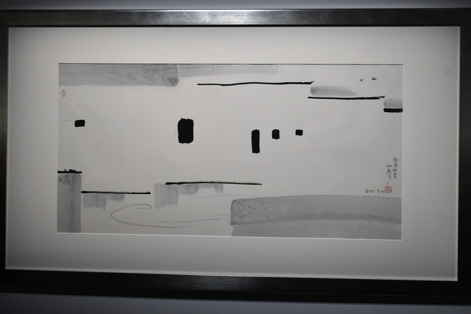 在色彩學上,黑白灰三色沒有彩度;若以科學物理角度,黑白甚至不是顏色,只是光線的明暗度。看似冰冷乏味的黑白,在吳冠中的筆下卻充滿了「溫度」。香港藝術館館長(至樂樓)鍾婉嫻對香港商報記者表示,是次焦點展品、鎮館之寶《雙燕》是吳冠中的代表作:「畫作描繪了江南景色,吳冠中曾表示故鄉江南的素淨牆身讓自己想起宣紙,因此他將白牆放進畫中,呈現橫直、黑白對比之美,巧妙之處在畫作的上方加了一雙燕子,表達出他對故鄉的情懷,為作品加添絲絲暖意。」後來,吳氏創作另一幅畫作《憶江南》,作為《雙燕》的延伸,是次會同時展出。該畫的景物被簡化成幾條橫線和幾個黑點,依然配上一對點睛的燕子,但從具象到接近抽象的創作,更能感受到藝術家對故鄉情感的昇華。