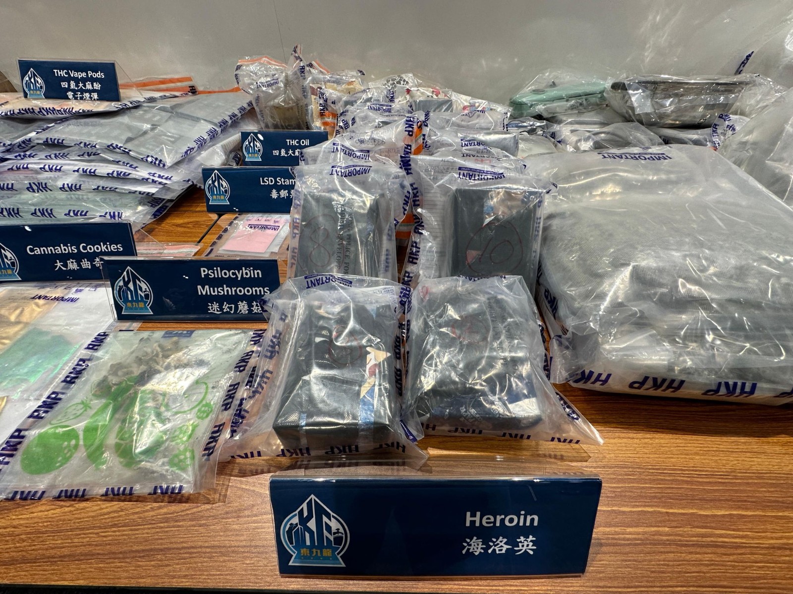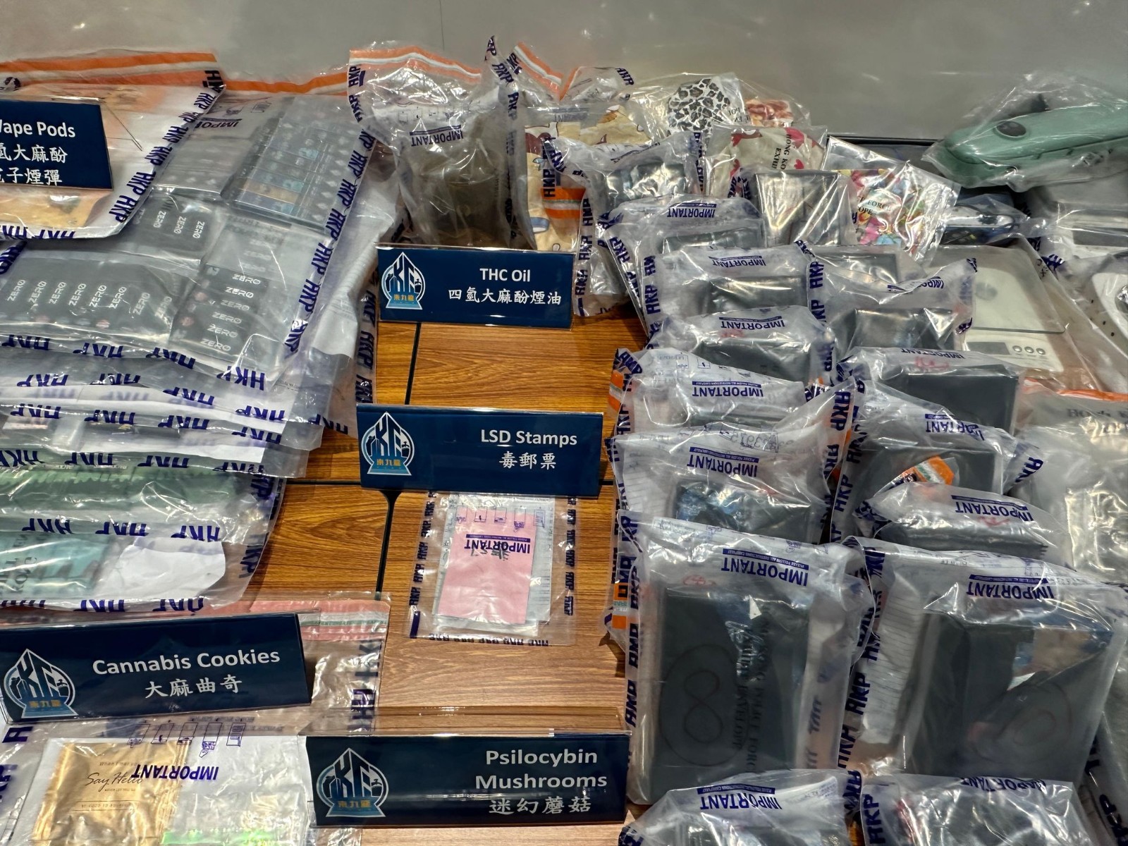 行動中,人員檢獲市值1200萬元毒品,包括約12公斤海洛英、約8公斤大麻花、270支大麻電子煙、約500毫升大麻油,以及大麻糖、大麻曲奇、迷幻蘑菇、毒郵票,同時檢獲製毒及包裝毒品的工具。