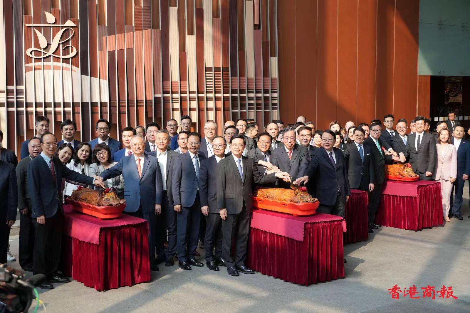 在平頂儀式上,李家超與官員及梁君彥、行管會成員將22個議員辦公室MiC模型放在擴建後的大樓模型裝置上,即時持續展示耀眼彩光,寓意立法會五光十色,生生不息。之後眾人一齊按傳統切燒豬,並一口氣分工合作切5隻燒豬,一切切到尾,寓意擴建工程大吉大利,香港五福臨門。