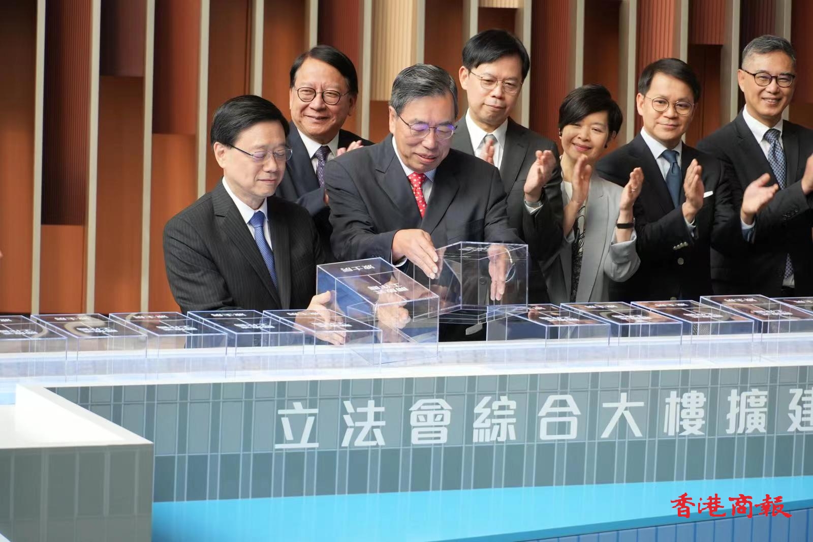立法會綜合大樓新建的議員樓層今日(23日)順利平頂。行政長官李家超、政務司司長陳國基、政府跨部門團隊、立法會主席梁君彥及一眾立法會議員一同出席平頂儀式,見證擴建工程邁進新里程。