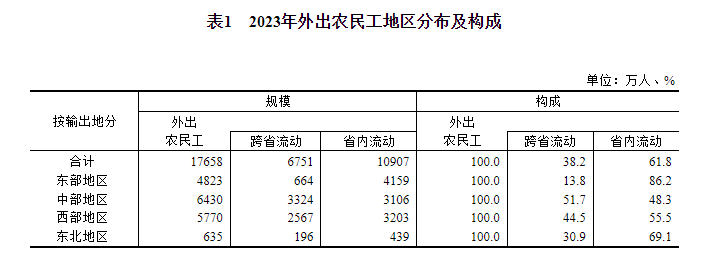 在外出農民工中,跨省流動6751萬人,佔比38.2%;省內流動10907萬人,佔比61.8%。分區域看,東部地區外出農民工中跨省流動佔13.8%,中部地區佔51.7%,西部地區佔44.5%,東北地區佔30.9%。