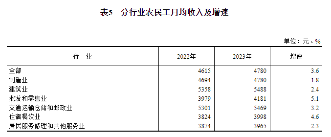 分行業看,六大行業收入均保持增長。從事製造業農民工月均收入4780元,增長1.8%;從事建築業農民工月均收入5488元,增長2.4%;從事批發和零售業農民工月均收入4181元,增長5.1%;從事交通運輸倉儲和郵政業農民工月均收入5469元,增長3.2%;從事住宿餐飲業農民工月均收入3998元,增長4.6%;從事居民服務修理和其他服務業農民工月均收入3965元,增長2.3%。