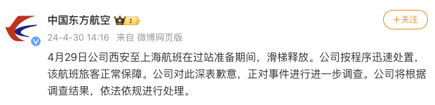 據中國東方航空微博消息,4月29日公司西安至上海航班在過站準備期間,滑梯釋放。公司按程序迅速處置,該航班旅客正常保障。公司對此深表歉意,正對事件進行進一步調查。公司將根據調查結果,依法依規進行處理。
