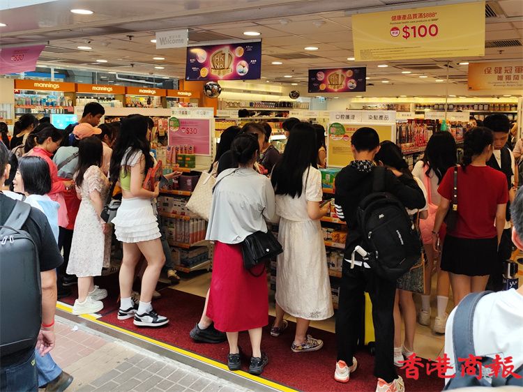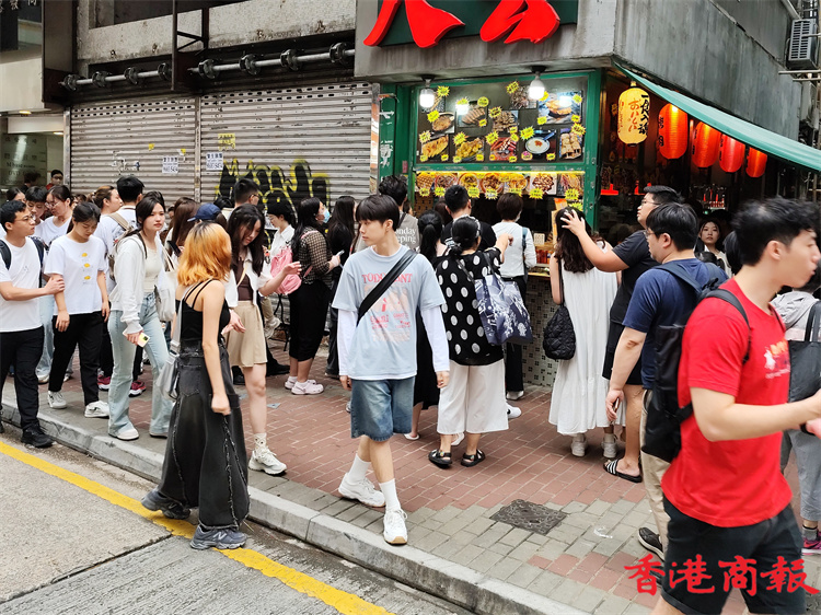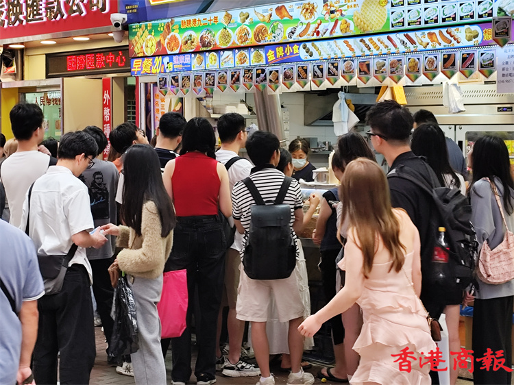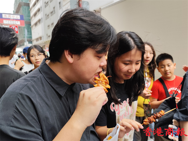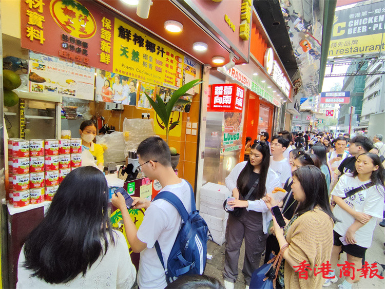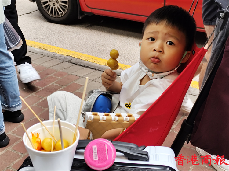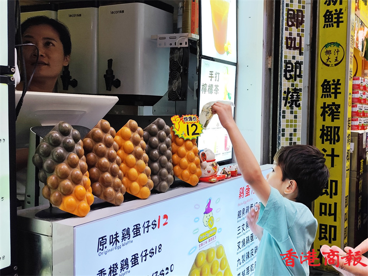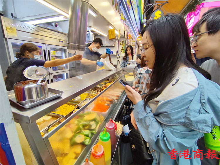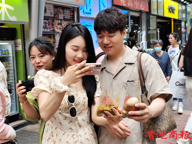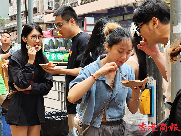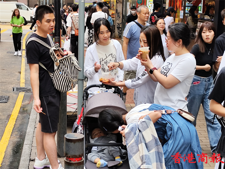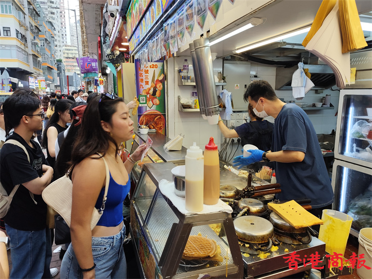 進入五一黃金周第三天,遊客們繼續「買買買」、「吃吃吃」。其中旺角是香港美食的集中地,當然會吸引遊客慕名而來。雞蛋仔、牛雜、咖喱魚蛋等更是不少遊客趨之若鶩的美食,令到不少售賣小食、特式飲品的小店門庭若市,顧客大排長龍。不少遊客對香港的美食讚不絕口。此外,旺角著名的女人街、波鞋街,以及藥店、金舖等的顧客都是川流不息。(馮瀚文攝)