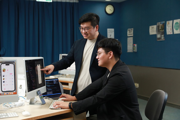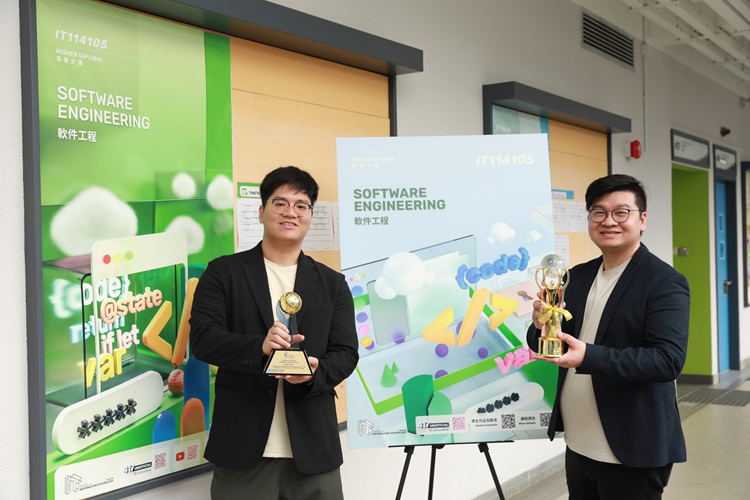 HKIIT高級講師郭譽豪(右)、VTC軟件工程高級文憑畢業生黃俊(左)憑「Dokodemo Call 隨意通」作品獲得多個中港創科比賽獎項。大會供圖