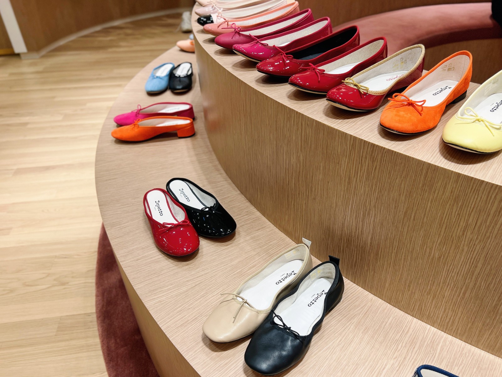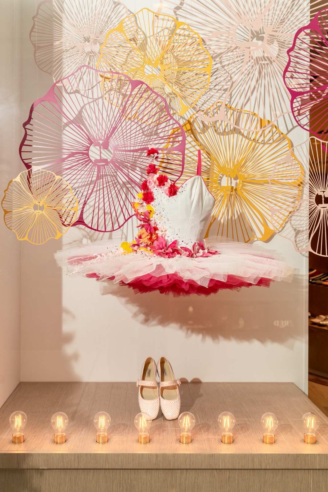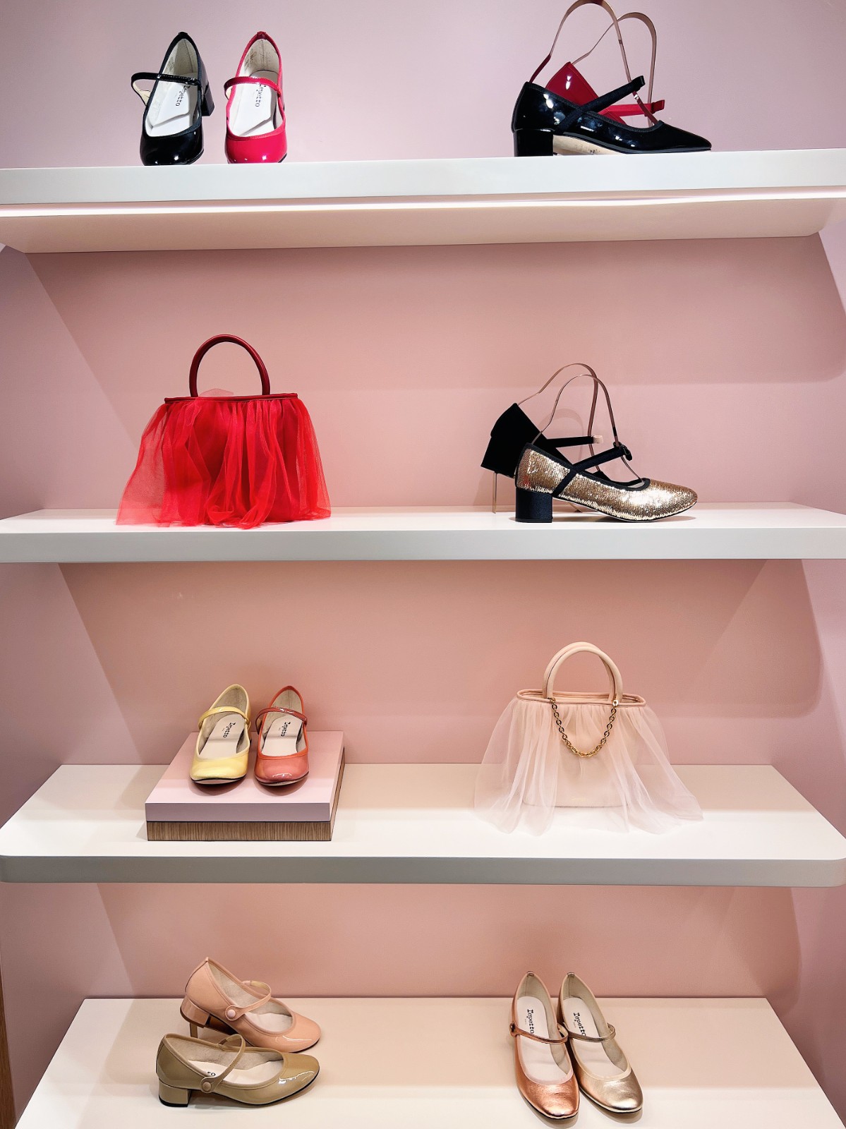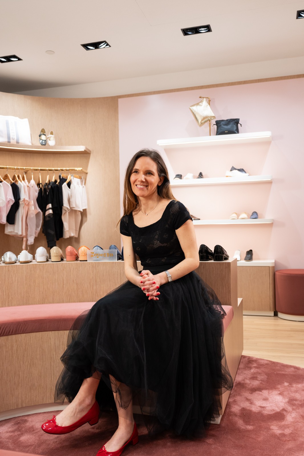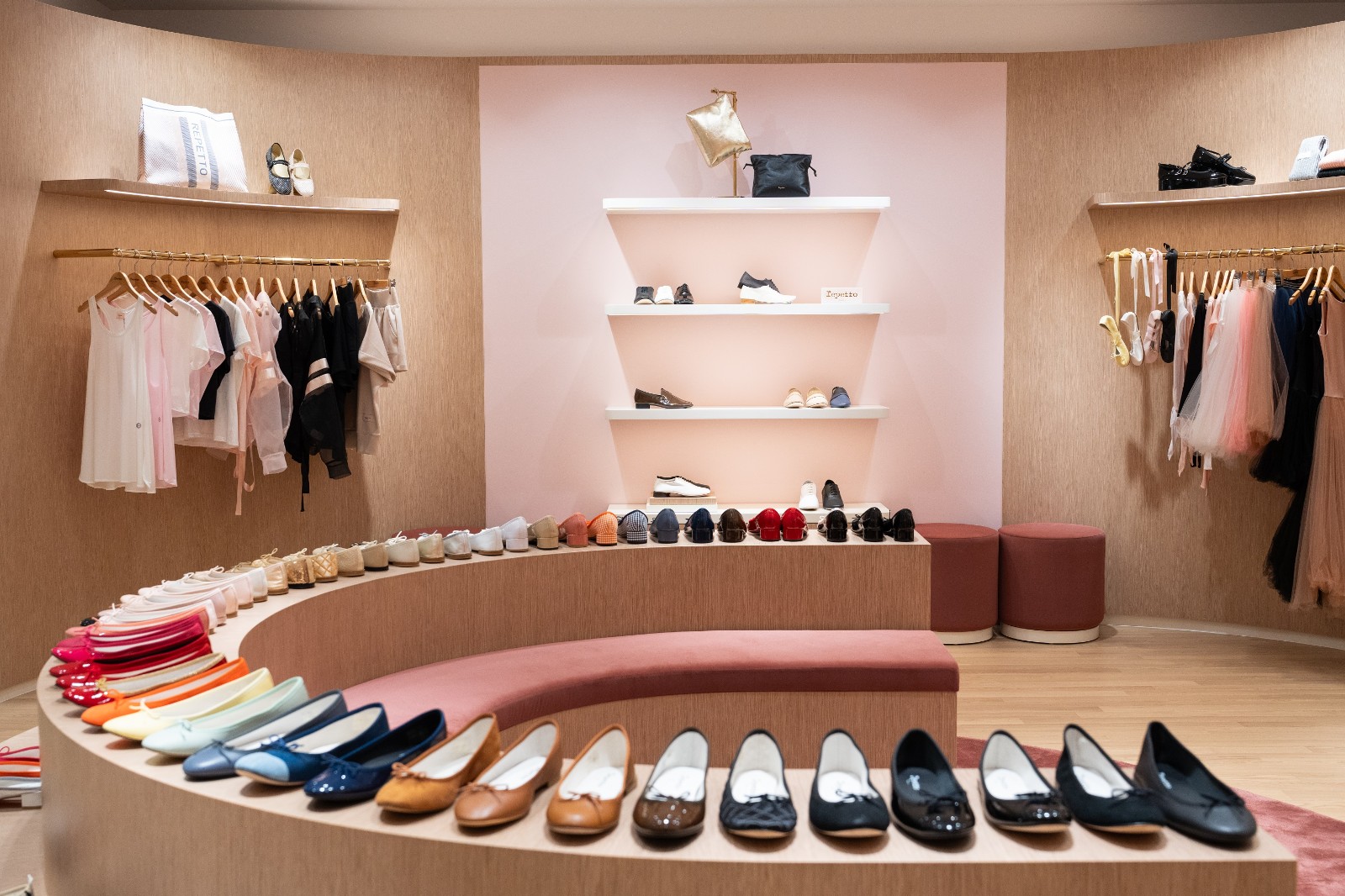 旗艦店以現代方式演繹芭蕾舞元素,設有包括舞室的全身鏡子、木地板、舞者的扶手桿,每位顧客皆可穿上精緻工藝鞋履,成為射燈下的主角。櫥窗位儼如迷你藝術館展現了花卉藝術裝置,店舖的色調、設計元素讓人恍如置身芭蕾舞台,舞台中央是舞者的裙擺——以半圓弧形設計、芭蕾舞短裙般的芭蕾舞鞋展櫃,展示了品牌標誌性芭蕾舞鞋款的所有顏色。