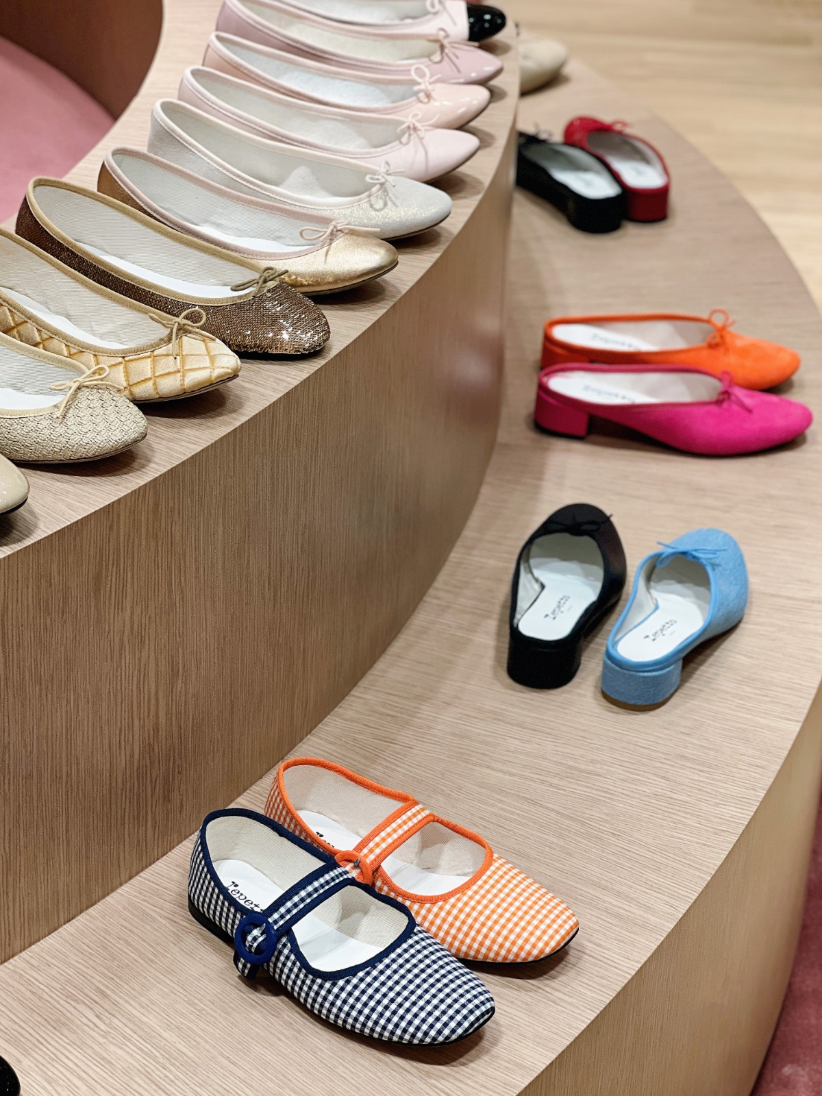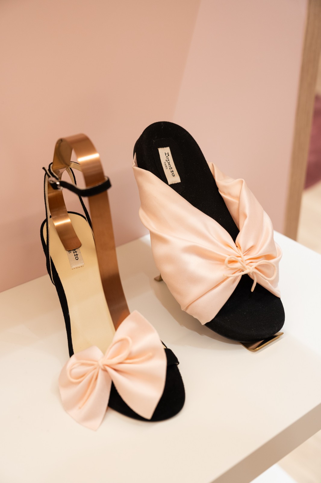 店內每一雙芭蕾舞鞋都秉承着創辦人的反縫針法手工傳統,鞋款包括Cendrillon、Camille、Rose、Michael、Zizi等系列,並展示品牌最新推出,集時尚、現代、高貴的高跟鞋款式,如型格又優雅的Jordana Heeled Mules換上別具度假風的變奏,以拉菲草編成露趾高跟鞋,亦是Jordana 60系列產品之一,幾何設計的鞋頭顯氣質。鞋身細節包括羅緞緞帶飾邊,配搭以蕾絲為襯裏,觸感柔軟,同時帶出悠閒而雅致的夏日感。新系列Juanita Sandals展現活力時尚的一面,以纖細的Salomé踝帶環抱雙腳並飾以精緻的壓平蝴蝶結,與闊底高跟形成視覺上的對比,舒適又別具風格。黑色典雅的細跟高跟鞋款Justine Sandals性感高貴,配品牌經典粉色緞子及蕾絲蝴蝶結,適合出席夏日派對。