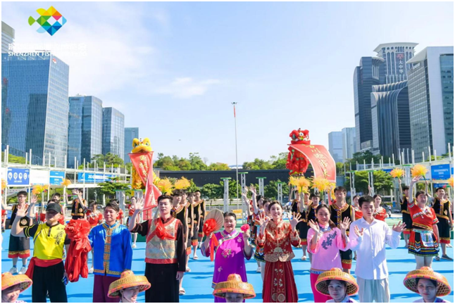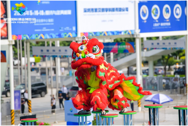 本屆展會開幕式一改傳統形式,別出心裁地融合了舞草龍、魚燈舞、南澳疍家迎親舞、蠔文化歌舞和嶺南醒獅等非遺元素,集合非遺傳承人和沙井、南澳本土漁民參演,用一場漁文化主題展演開啟今年的盛會。各駐華使領館代表、港澳台、各省市、商協會及企業代表出席開幕儀式。醒獅環節,中國農業發展集團有限公司(簡稱「中國農發集團」)總經理孔繁新與深圳港集團有限公司(簡稱「深圳港集團」)總裁沈華新落筆點睛,「魚躍龍門真蠔情 海納百川迎客來」,2024深圳漁博會正式開幕。
