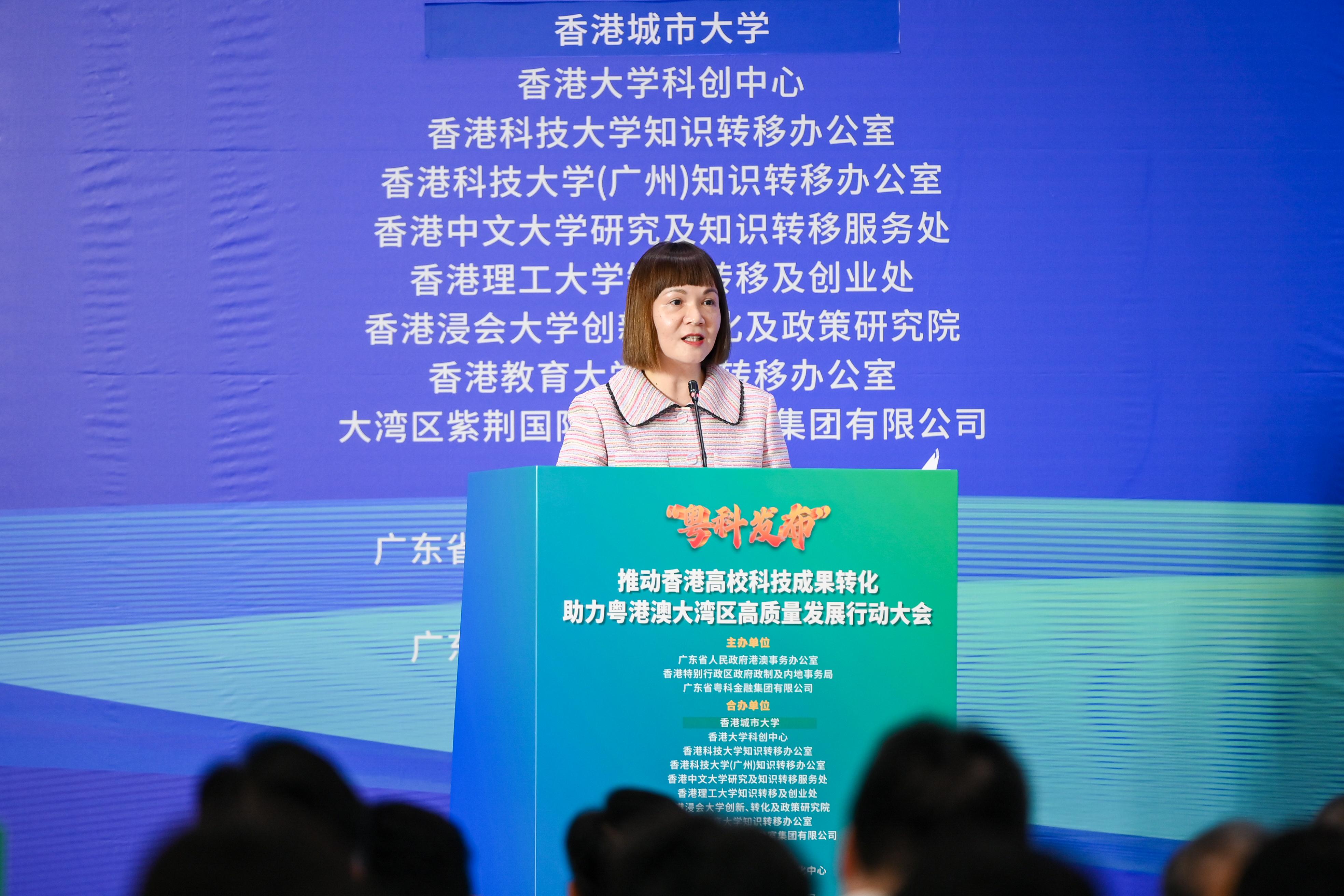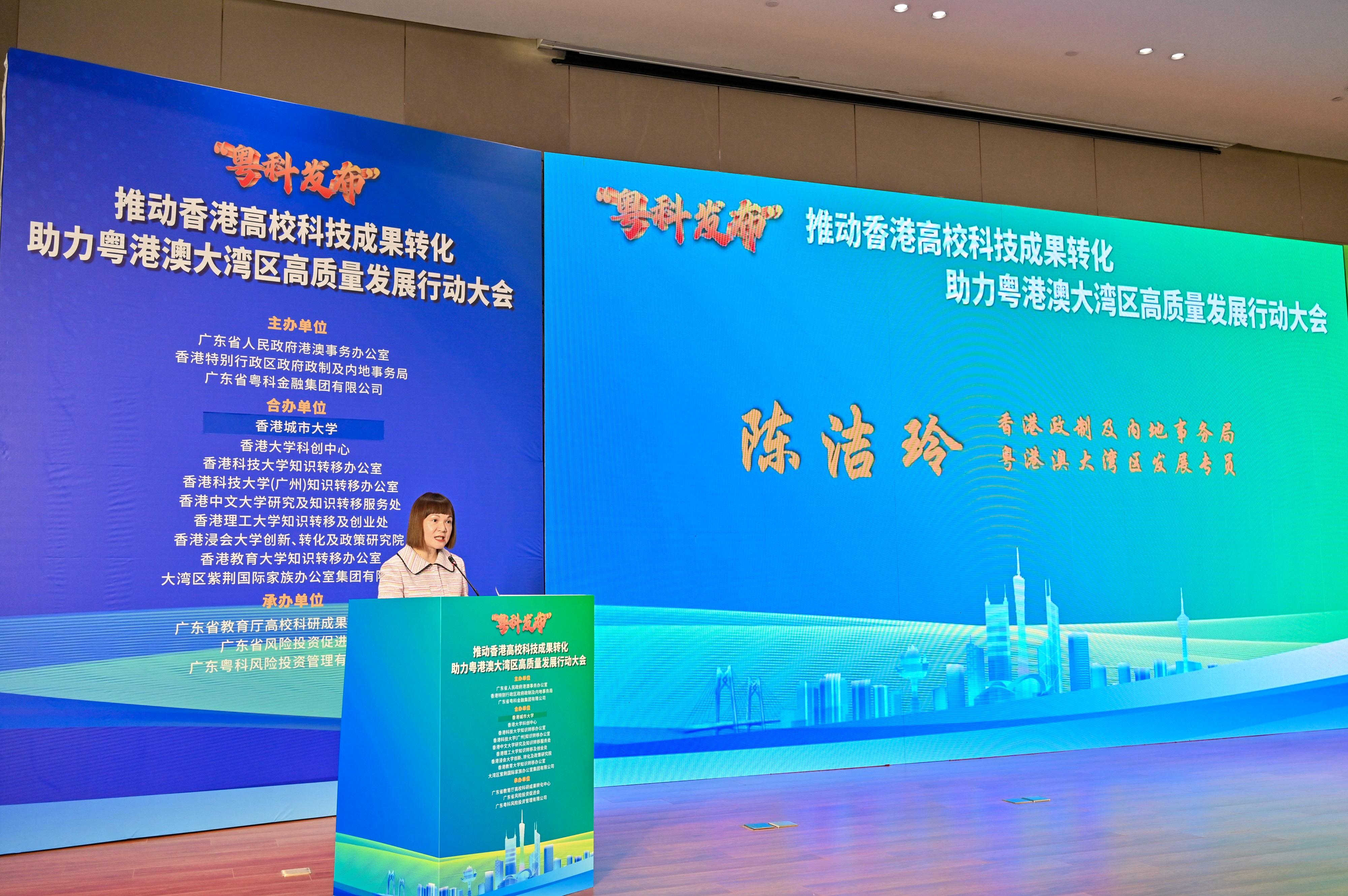 由廣東省人民政府港澳事務辦公室、政制及內地事務局及廣東省粵科金融集團有限公司(粵科金融集團)共同主辦的「『粵科發布』推動香港高校科技成果轉化 助力粵港澳大灣區高質量發展行動大會(行動大會)」17日在廣州舉行。粵港澳大灣區發展專員陳潔玲到廣州出席行動大會並致辭。