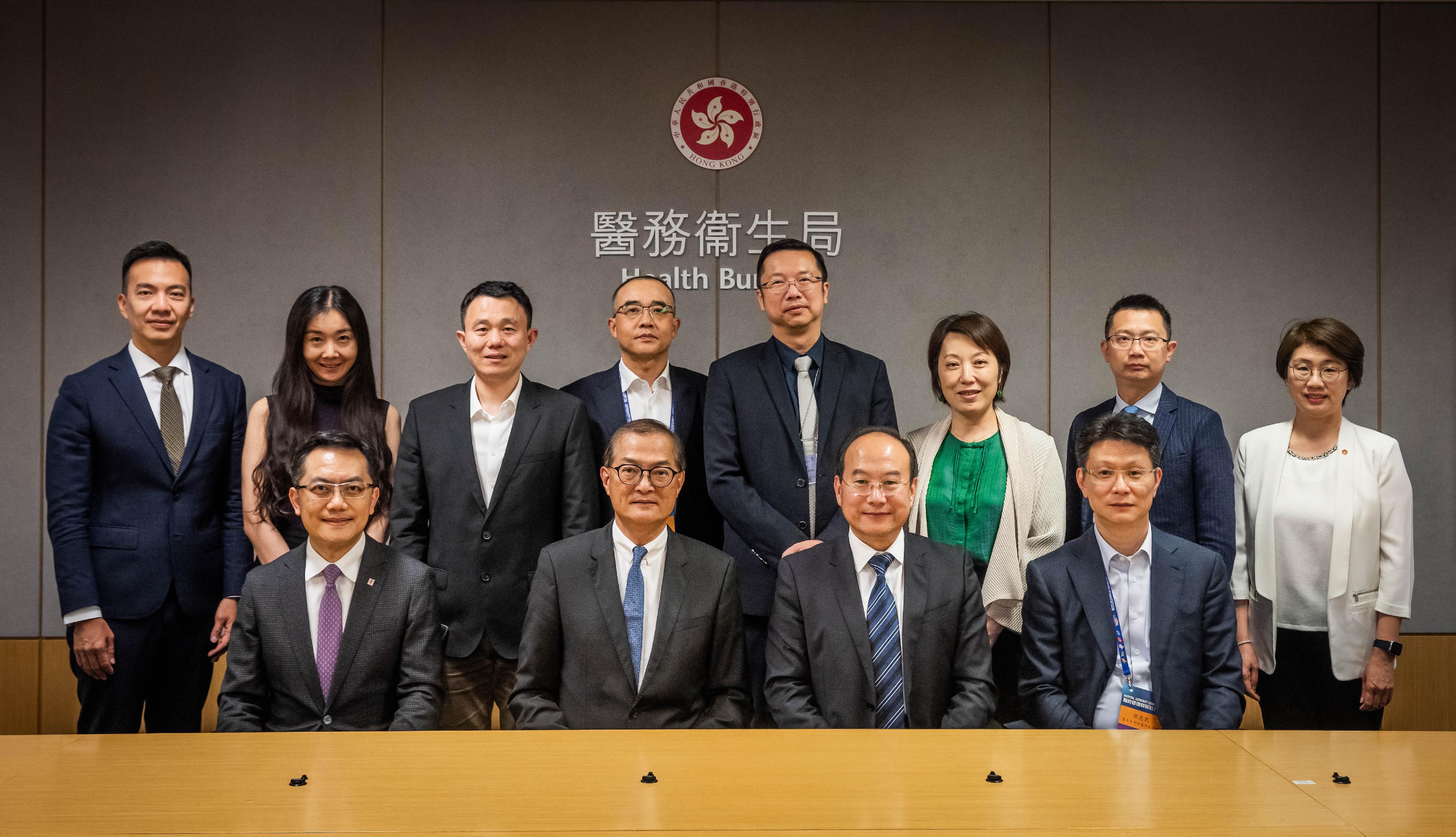 圖為盧寵茂教授(前排左三)、胡鴻毅教授(前排右三)、衞生署署長林文健醫生(前排左二)、醫院管理局行政總裁高拔陞醫生(前排左一)和其他與會者合照。圖源政府新聞處