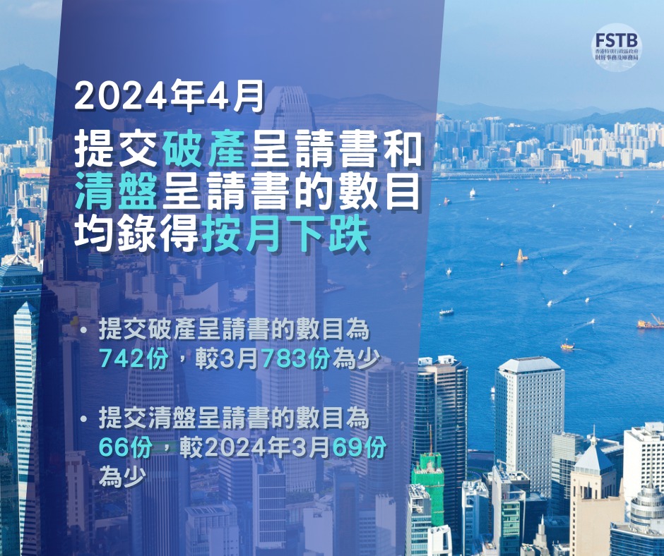 破產及清盤個案方面,今年4月提交破產呈請書和清盤呈請書的數目均録得按月下跌。4月提交破產呈請書742份,較3月的783份少;4月提交清盤呈請書66份,較3月的69份少。至於單月發出的破產/清盤令數目,通常與法庭在該月所進行的呈請書聆訊數目,及早前提交的呈請書數目有關,未必反映最新的情況。