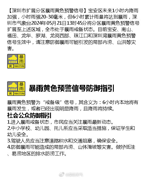 據深圳市氣象台消息,寶安區未來1小時內降雨加強,小時雨強20-30毫米,但6小時累計雨量將達到暴雨,深圳市氣象台2024年05月21日13時45分將分區暴雨黃色預警信號擴展至上述區域,全市處於暴雨戒備狀態。目前寶安、南山、福田、龍華、羅湖、龍崗西部、珠江口和深圳灣暴雨黃色預警信號生效中,請注意防禦暴雨可能引發的局部內澇、山洪等災害。