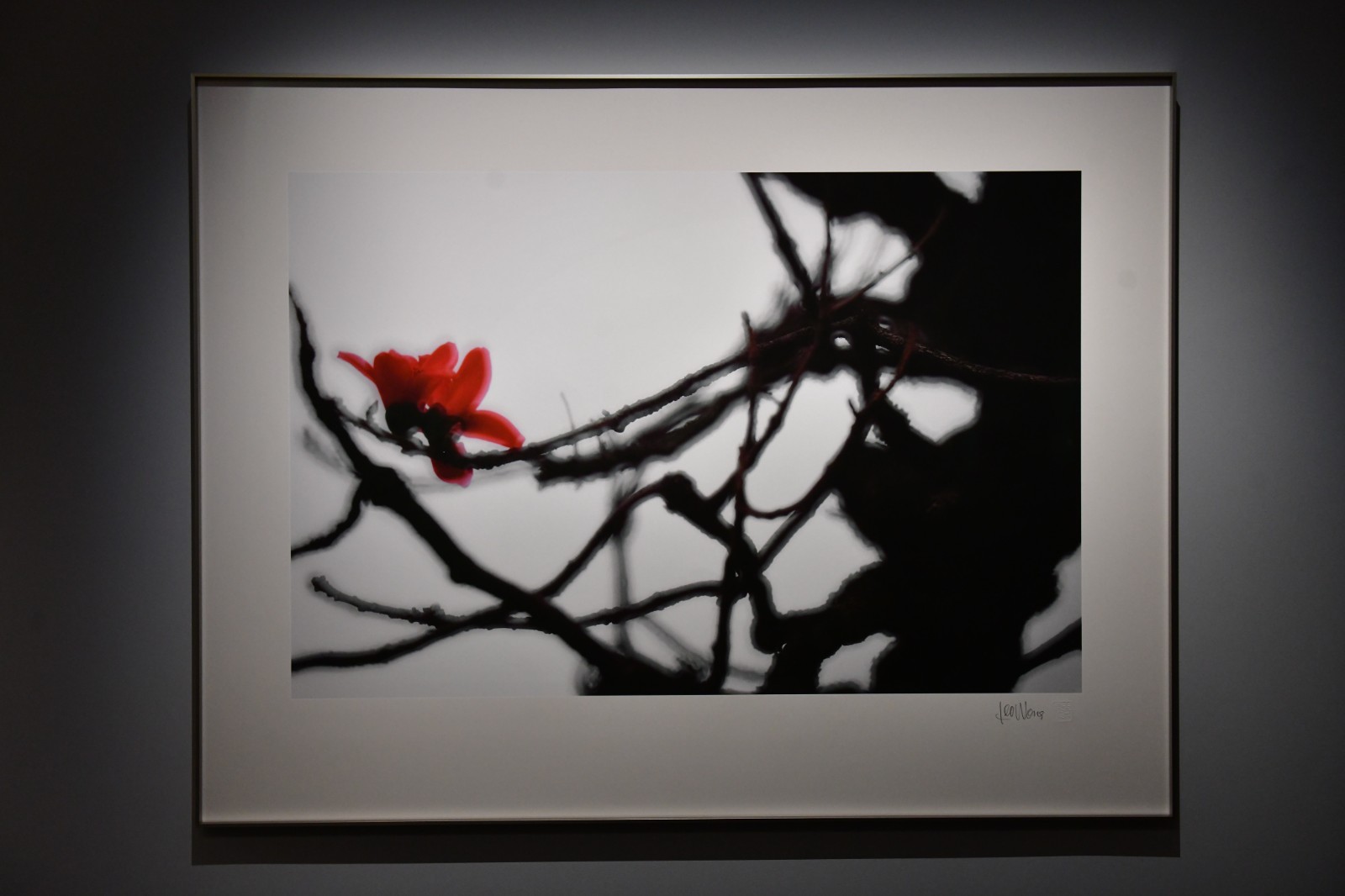 除發展出獨特的色調處理外,黃貴權的攝影風格亦從紀實轉為風景,景物作品中樹為點、山脈為線,予人抽象感。如展品高劍父的《草書五言聯》書寫了看世事要有慷慨豁達的心,若想提升自己須飽覽群書。「《草書五言聯》以枯墨和中鋒運筆的形式,展現出行氣、節奏感,仔細觀賞發現有乾墨的痕跡,恍如枯藤,讓人感受書寫者的力量,能從中國文字中發現大自然的特徵。」麥館長表示,《紅豔》與《草書五言聯》有異曲同工之妙,《紅豔》用超長焦距鏡頭進行風景拍攝,疏而有勢的木棉枝條表現如書法般的線條韻律感,又如同潑墨的揮灑效果,在紛亂的枝幹線條下,有朵柔美、火紅的木棉花,形成有趣的結構,既帶有水墨的意境,又放大了大自然的美態。 (記者:Janice 部分圖片:崔俊良)