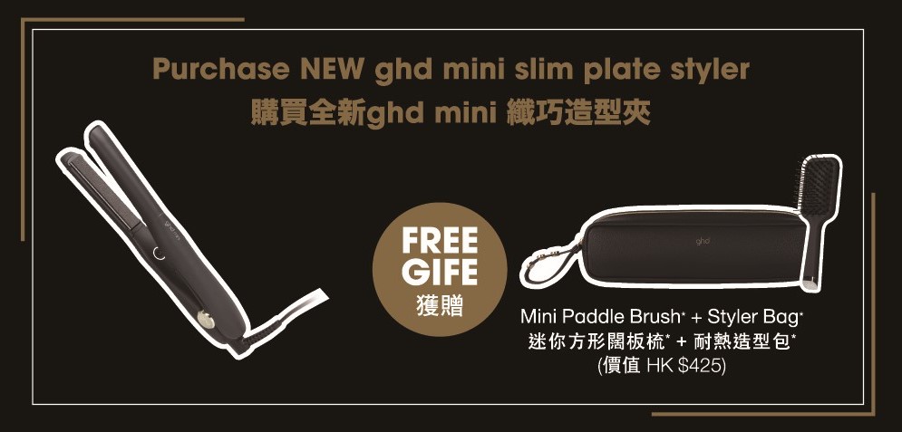 即日起,於品牌專門店或專櫃購買迷你纖巧造型夾,送迷你方形闊板梳及耐熱造型包一個(價值HK$425)。 (記者:Janice)