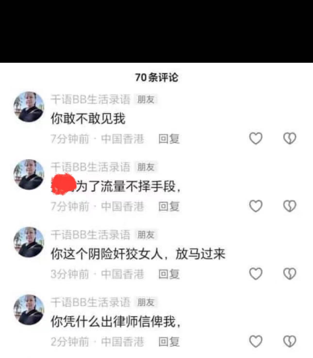 何太其後在抖音粉絲群連珠砲發式狂轟翁靜晶出律師信一事,「放馬過來」、「你敢不敢見我」、「你憑甚麼出律師信畀我」、「當我唔善良的時候第一時間就係同你攬抄(炒)」,並斥翁靜晶「為流量不擇手段」!(李華)