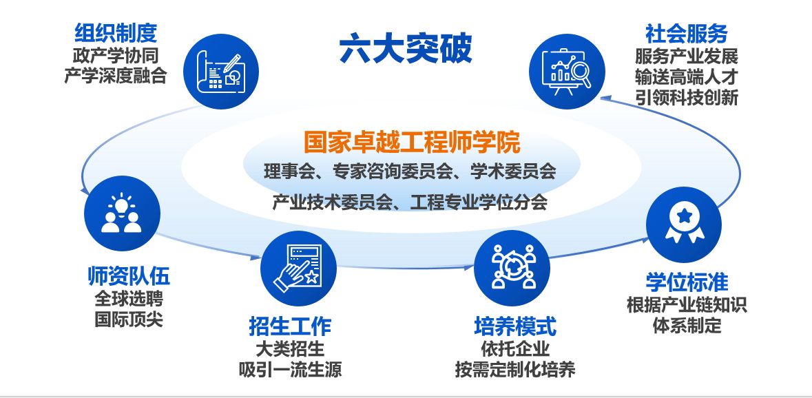 南科大國家卓越工程師學院通過建立健全政產學管理組織架構,打造產學協同育人新模式。學院實行理事會負責制,構建理事會領導、院長負責、專家諮詢委員會指導、學術委員會治學的運行機制,並在組織制度、師資隊伍、招生工作、培養模式、學位標準、社會服務方面實現六大突破。