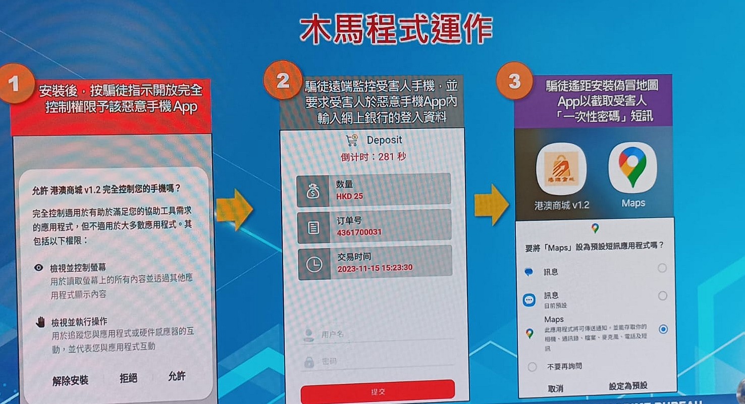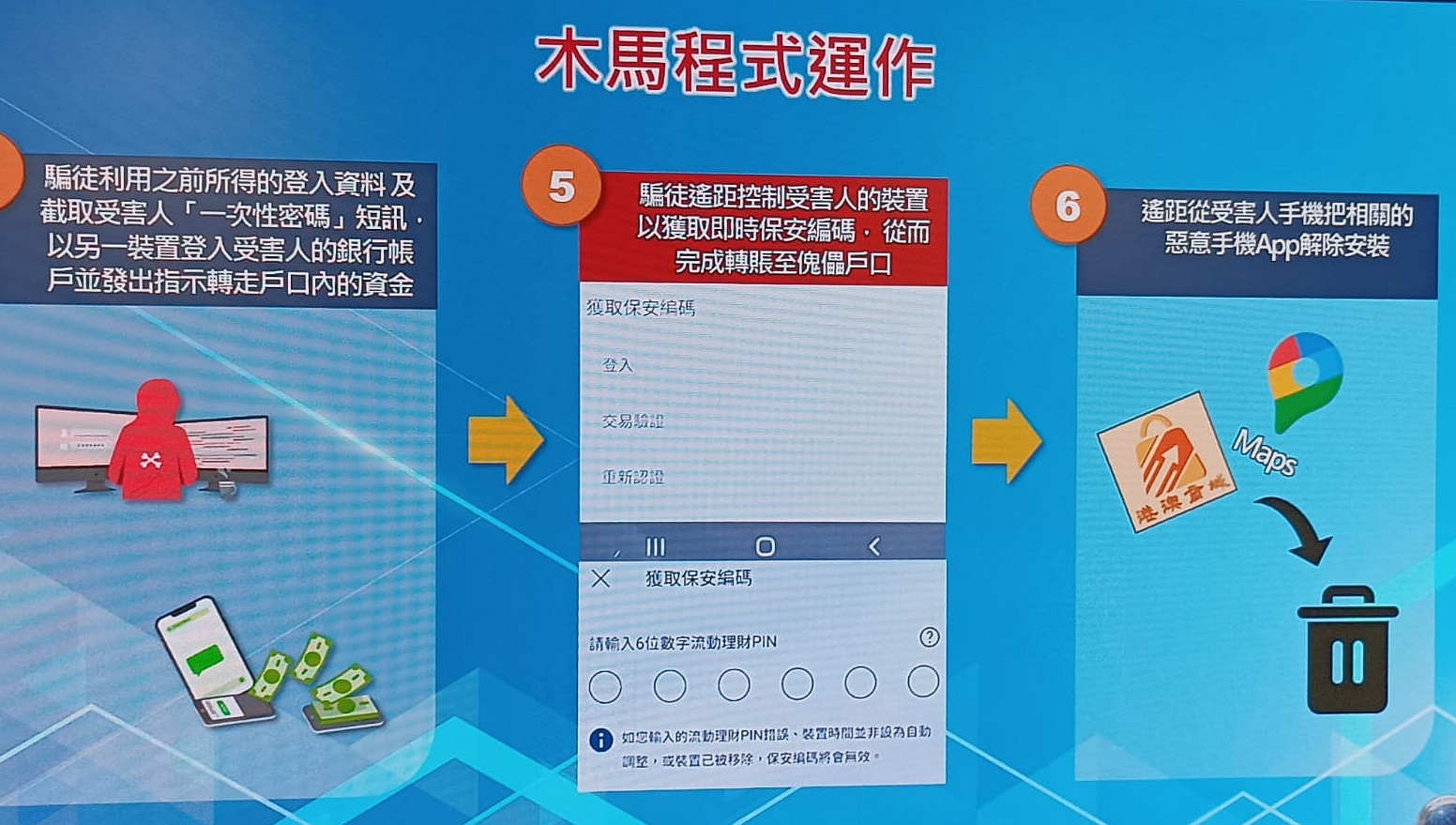 網罪科總督察劉傲松表示,經數碼法理鑑證後,得知木馬程式要求開放全部權限,騙徒可實時監控受害人手機。為加強防範惡意木馬應用程式,網罪科在去年11月底到新加坡與當地機構進行深入交流,包括探討海外市場推出的反惡意程式安全功能,評估是否適用於香港,提升本地金融機構的網絡安全水平,香港金管局與不同地區的監管機構交流,參考國際上不同地方防範惡意程式的措施。金管局就惡意程式的騙案去年第四季向業界發出指引,要求銀行持續加強保安措施。(記者 區天海)