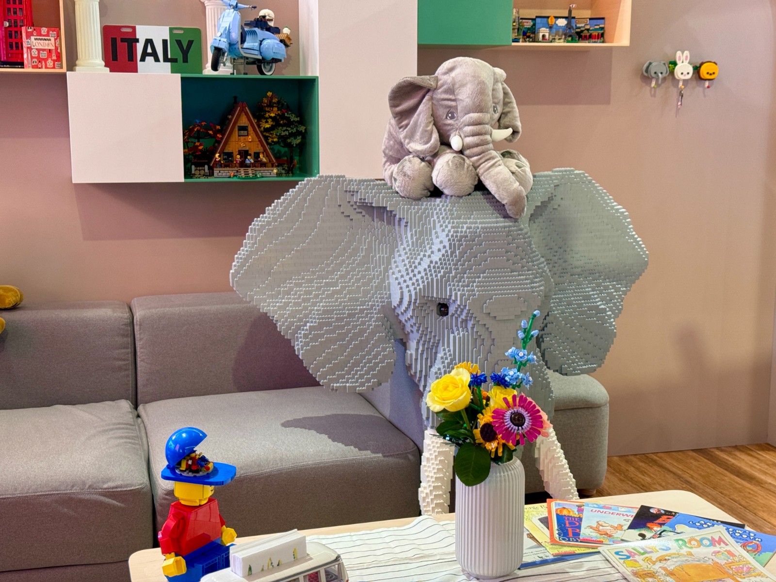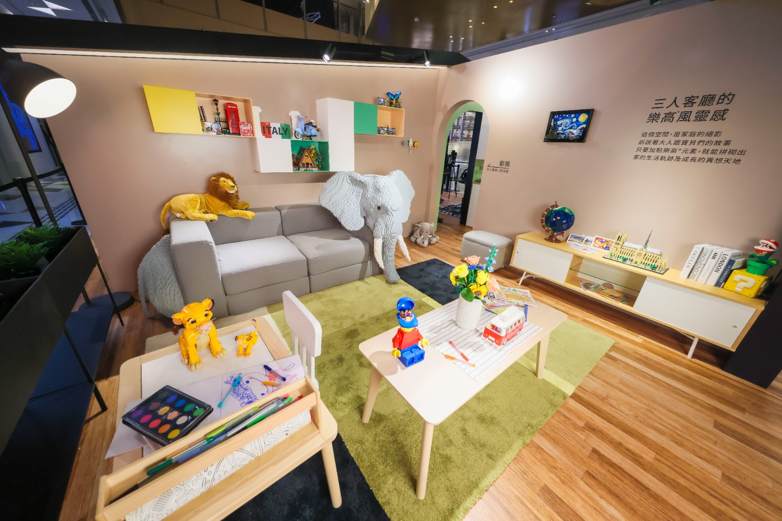 展廳內分為三個主題空間,每個空間都通過LEGO盒組和由專業認證大師洪子健等拼砌達人設計的作品,展示如何將LEGO顆粒和創意融入不同的裝潢風格中,創造具有個人特色的家居布置。首個空間設計為一個溫馨而簡約的客廳,適合喜歡旅遊和冒險的家庭。該空間中不僅展出Ideas系列的地球儀和紅色倫敦電話亭等模型,還有由洪子健設計的LEGO大象沙發「動物大遷徙」,該作品使用超過三萬顆粒打造,為灰色雙人沙發增添了視覺衝擊力。此外,展間還有其他由拼砌達人設計的功能性裝飾品,如動物掛鈎和行李箱造型相框。