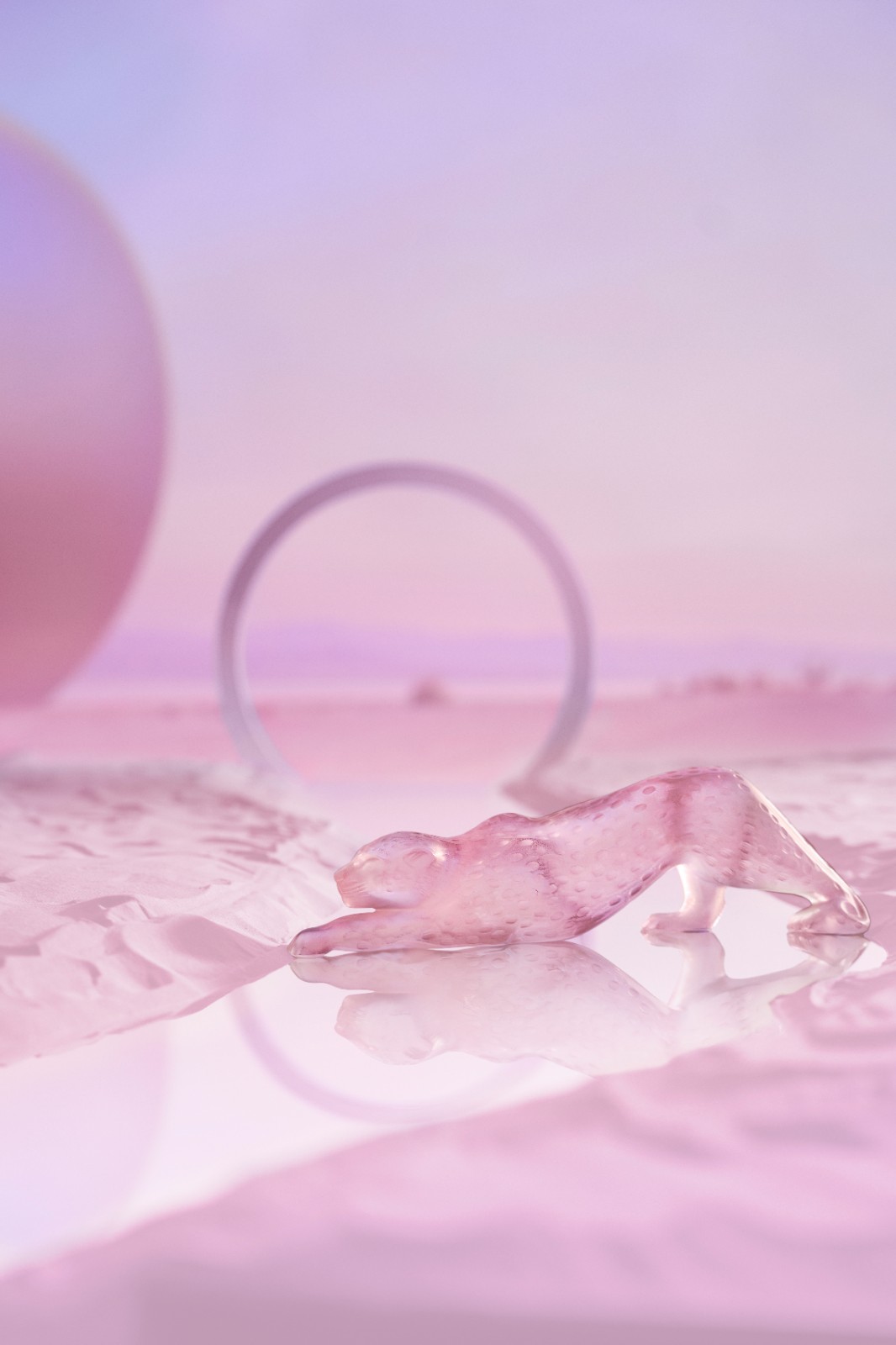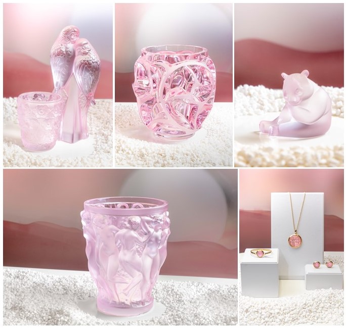系列標誌性作品被罩上粉紅色面紗,將遠古時代的遺跡和立體投影結合,展示了酒神女祭司、美洲豹和迷人的鳥兒等元素。包括品牌1927年由 René Lalique 設計的 Bacchantes(豐收十美女)花瓶、1930年的 Moineau Sparrow(小麻雀)雕塑,以及1933年的 Mossi(圓滿寶瓶)花瓶,這些作品在新系列中以粉紅色調重新演繹。