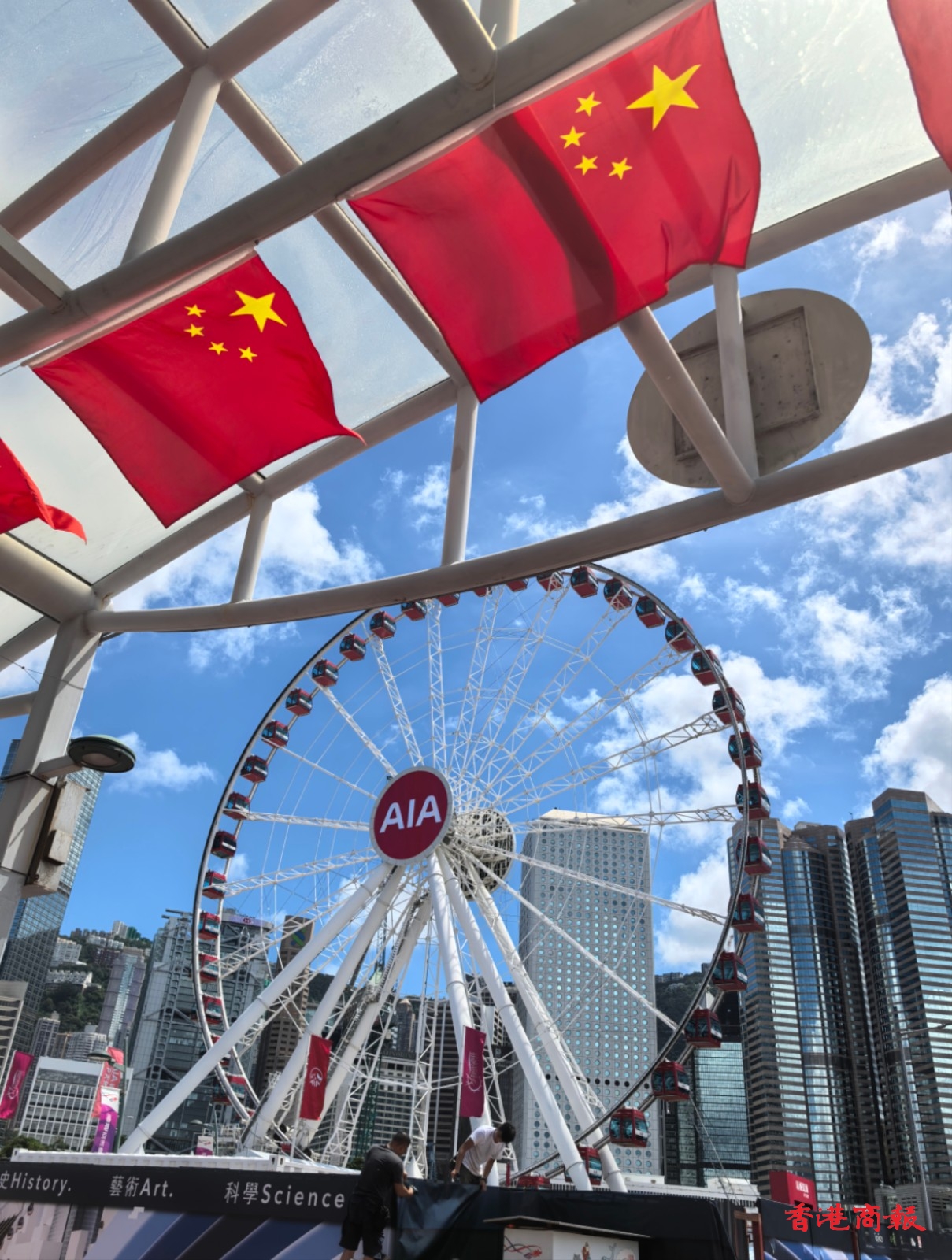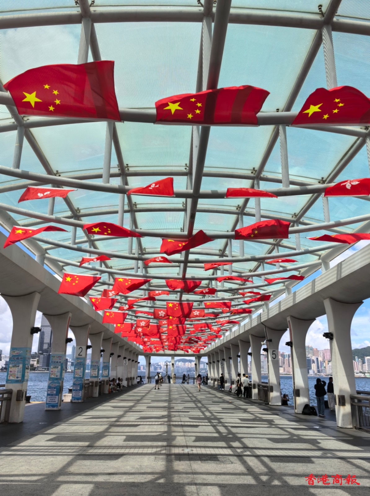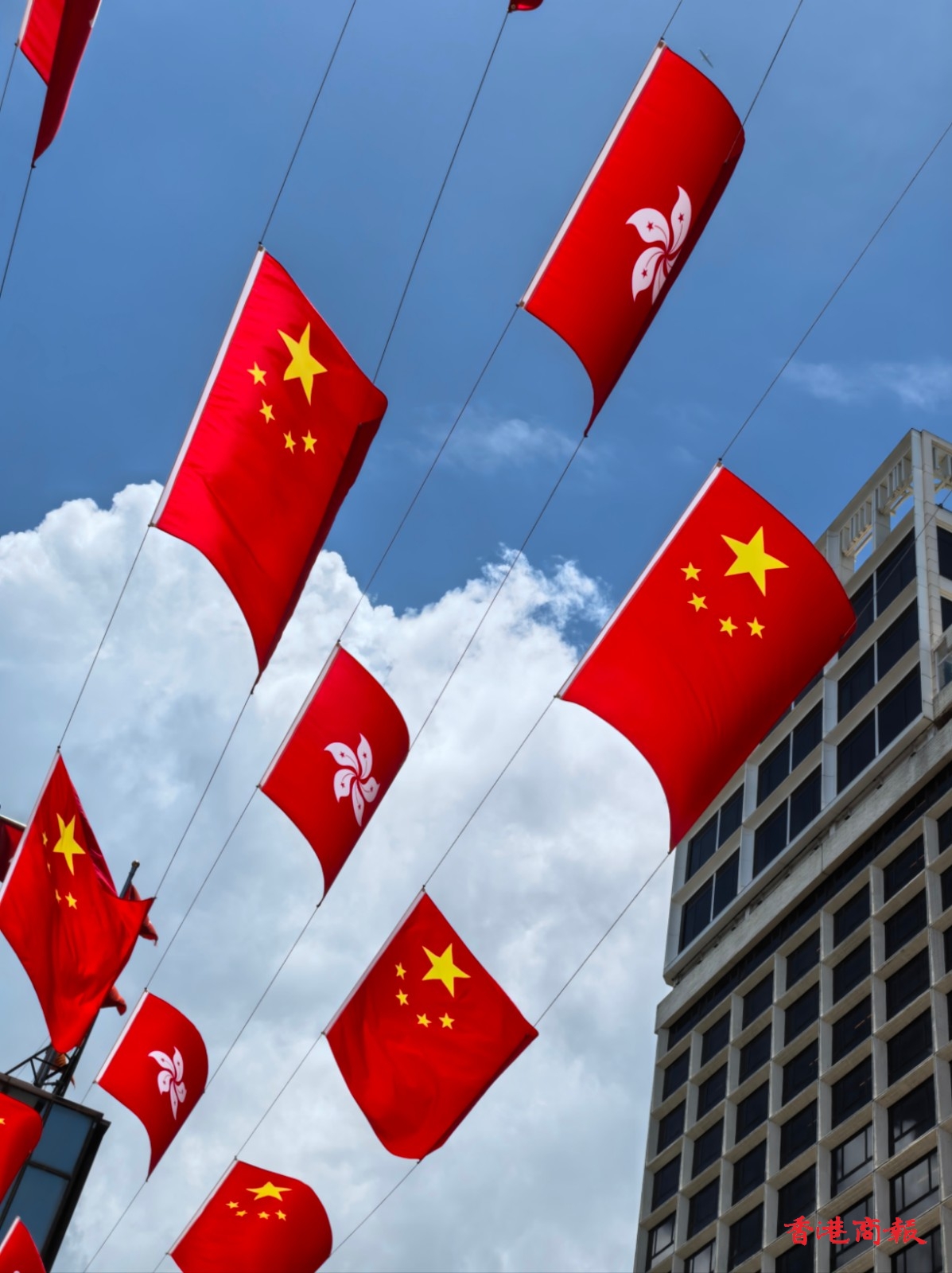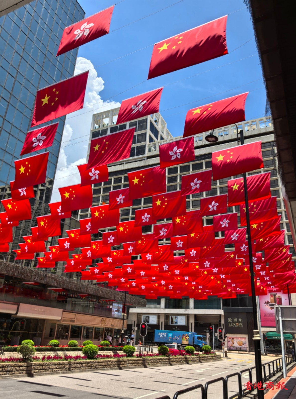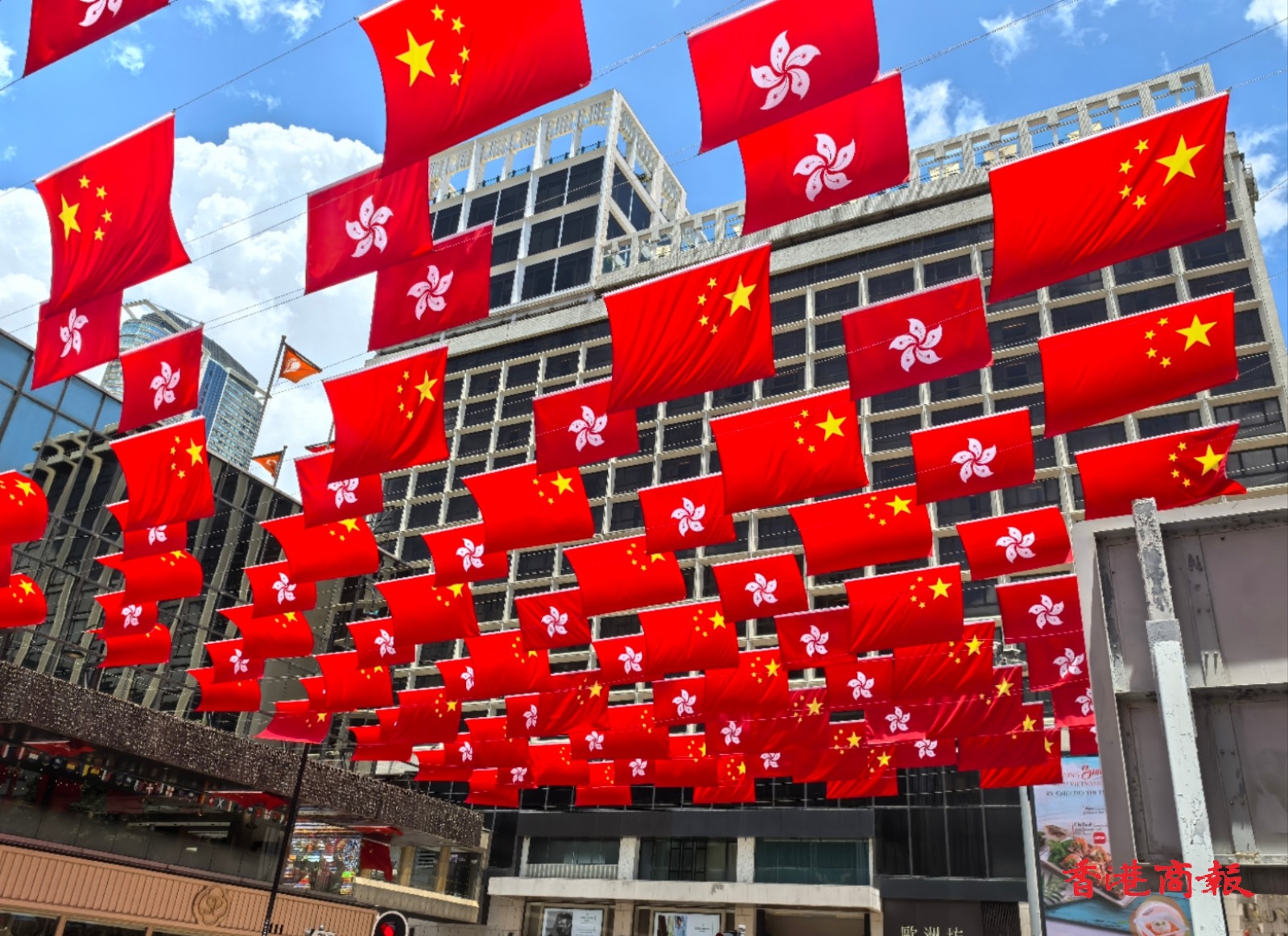 無論是高樓大廈還是古朴街巷,都懸掛着這兩面旗帜,形成一道亮麗的風景線。街上的行人紛紛駐足觀看,臉上洋溢着自豪與喜悅的笑容,共同觀賞香港回歸之後的繁榮景色。(記者 李承泰)