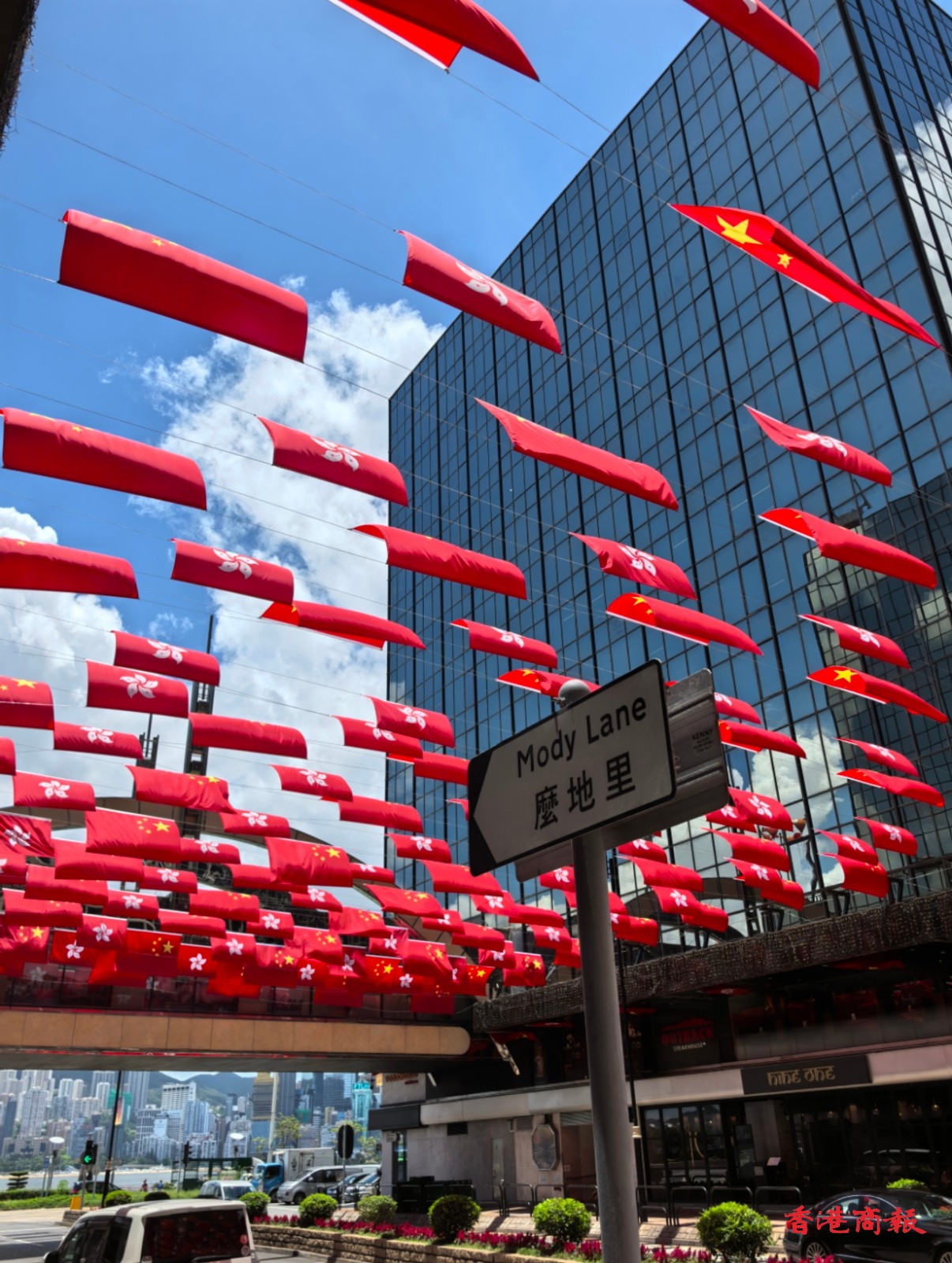 距離7月1日香港回歸祖國27周年還有4天,香港的大街小巷被五星紅旗與香港區旗裝點得格外醒目。五星紅旗在微風的吹拂下輕輕搖曳,鮮豔的紅色與金色的五星在陽光下熠熠生輝。