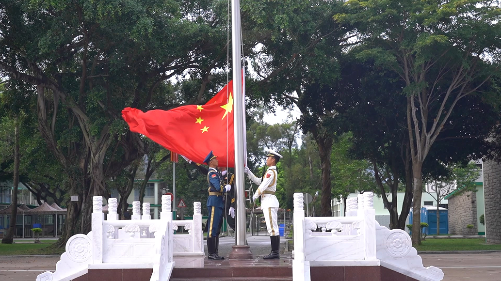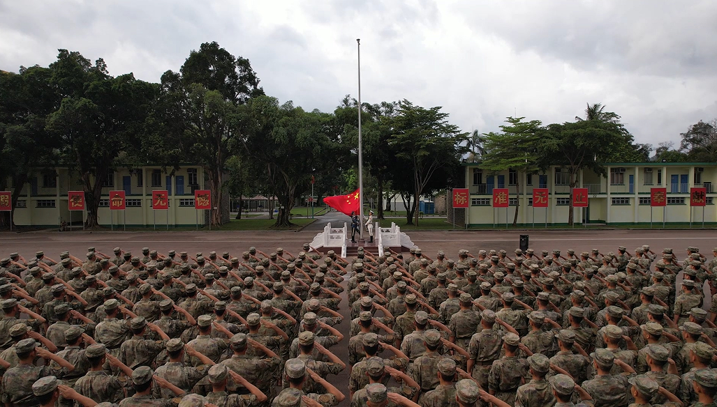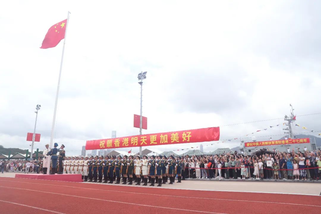 上午7時許,升國旗儀式在駐香港部隊中環、赤柱、石崗、新圍以及竹村等營區開始,駐軍官兵莊嚴列隊肅立。升旗手邁着鏗鏘有力的步伐護旗而出,伴隨着雄壯的國歌聲,鮮艷的五星紅旗冉冉升起、迎風招展。全體人員面向五星紅旗行軍禮,齊聲高唱國歌,表達對祖國和香港的美好祝福,堅定捍衛「一國兩制」偉大方針、維護香港長期繁榮穩定的信心決心。