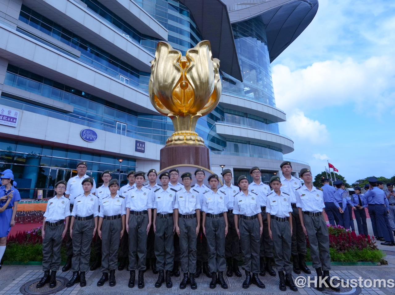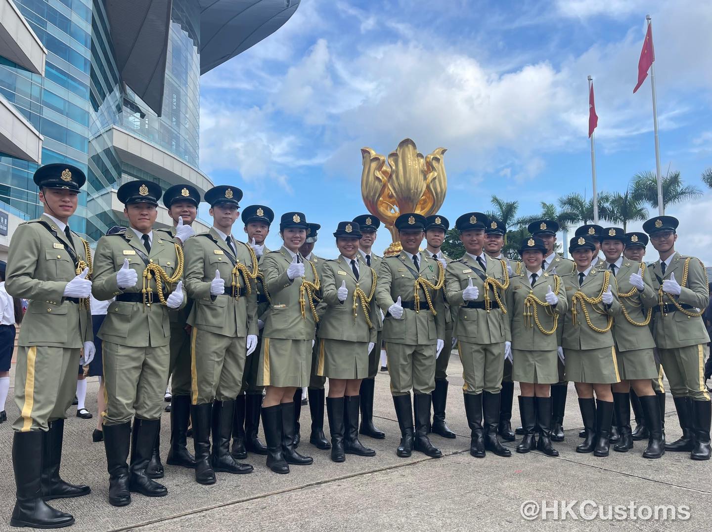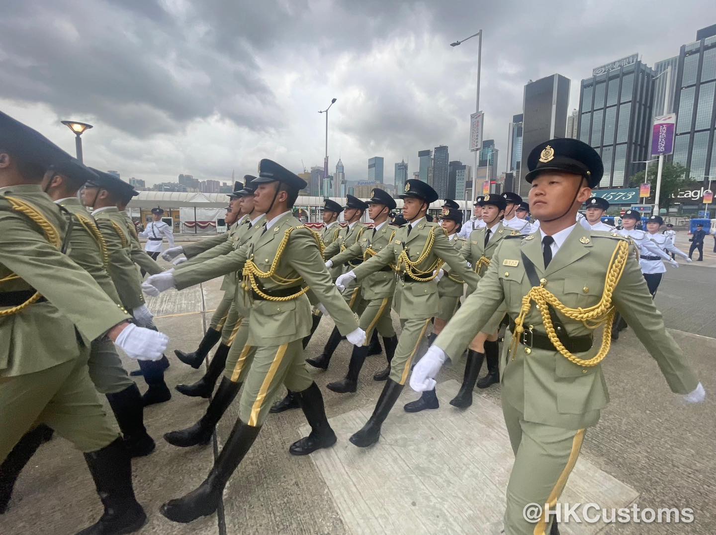 各紀律部隊儀仗隊及制服團隊步操隊伍昂然闊步地以中式步操進場參與升旗儀式,彰顯香港社會的繁榮和秩序。海關儀仗隊及海關青年領袖團亦有參與,共同慶祝回歸盛事。隊員及年輕的團員們親眼目睹升旗禮的莊嚴時刻,都不禁為身為祖國的一分子感到無比自豪。盼望祖國以及香港發展繼續繁榮昌盛,港人團結一致,共同為香港創造更輝煌的成績。(記者區天海)