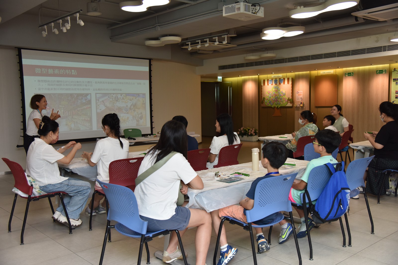 頂圖:煤氣公司與快樂微型藝術會安排導賞員帶領基層家庭觀賞「細看中西區微型展」展覽,講解作品背後的故事。