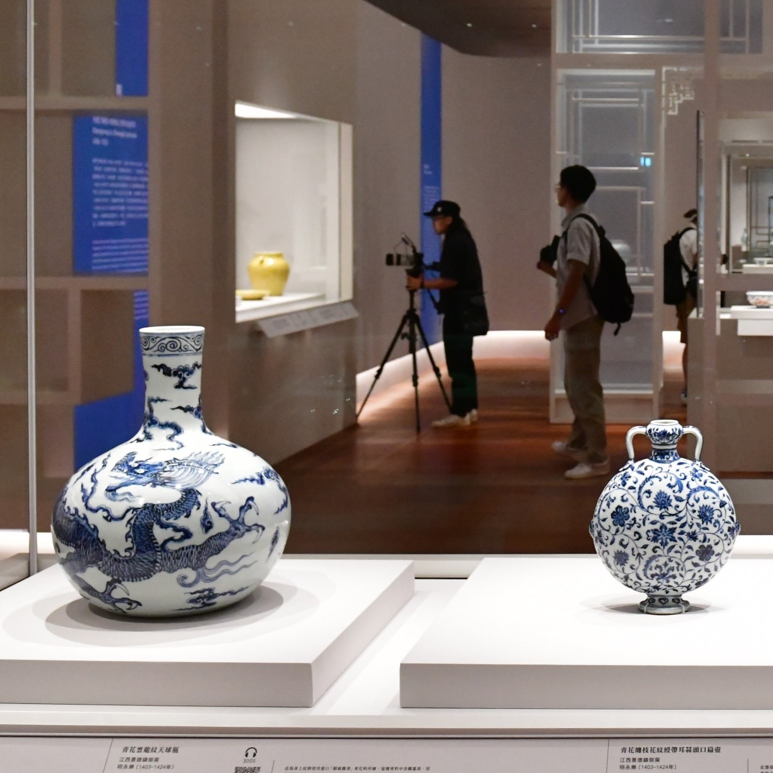 「青花雲龍紋天球瓶」為永樂時期(1403-1424年)製成,該時期的御窯青花瓷器色澤濃艷,所用的藍色着色劑為進口或來自西亞,展品瓶身上的紋飾使用進口「蘇麻離青」青花料所繪,青料含鐵量高,故發色濃艷,細看局部有黑色結晶斑。從釉料的使用,反映了明朝政府與西亞地區的密切交往,同時中國製作了許多器型或紋飾具西亞風格的瓷器,這些瓷器均見證了中外文化交流的繁榮。 ( 記者、 視頻拍攝剪輯:Janice 攝影:崔俊良)