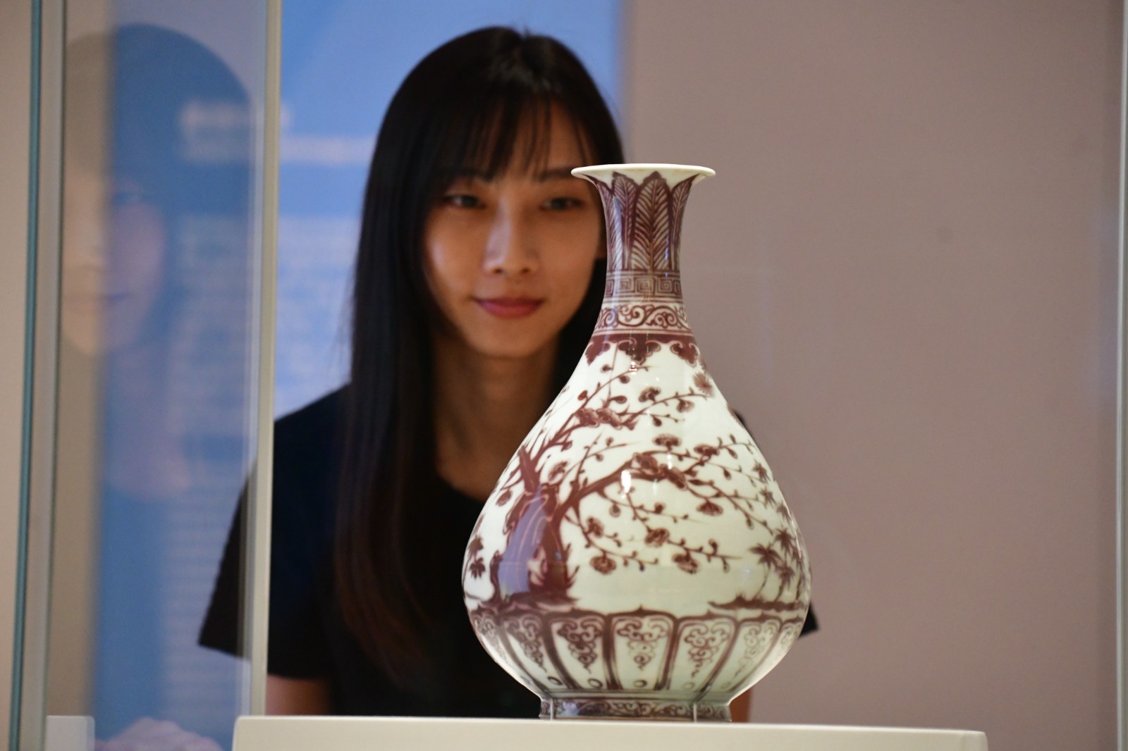 明代的瓷器之所以重要,還因為當時的燒製技術甚為精湛。展品「釉裏紅松竹梅圖玉壺春瓶」是以氧化銅作為着色劑的高溫釉下彩瓷,銅紅色料的呈色鮮艷。黃煒均介紹,銅作為着色劑時,對溫度相當敏感,燒製時稍不慎顏色就會偏灰偏黑,展品是當時罕有的佳作。「瓶身繪有稱為『歲寒三友』的松、竹、梅紋飾,象徵高風亮節、長壽、堅毅不屈。」