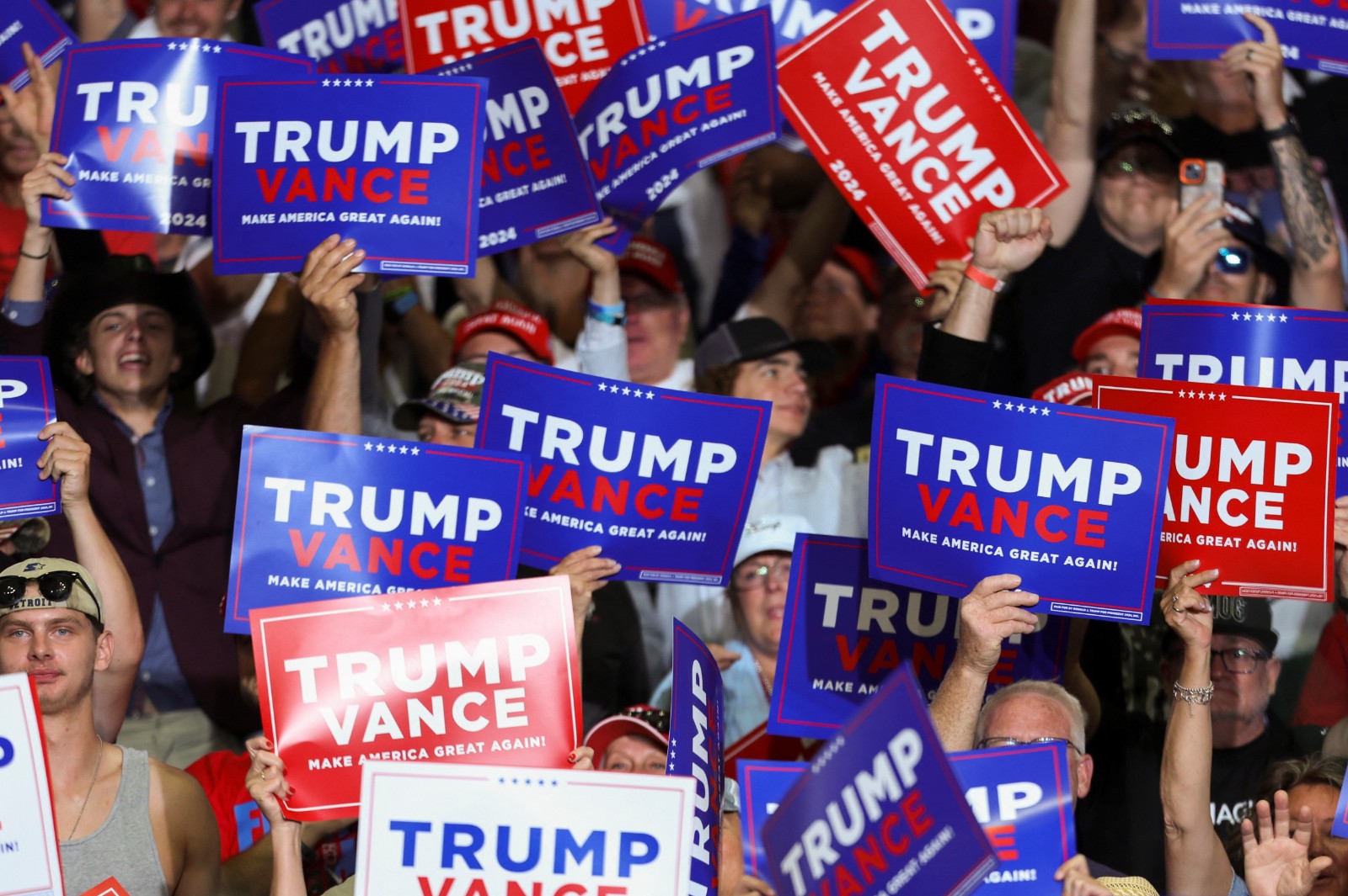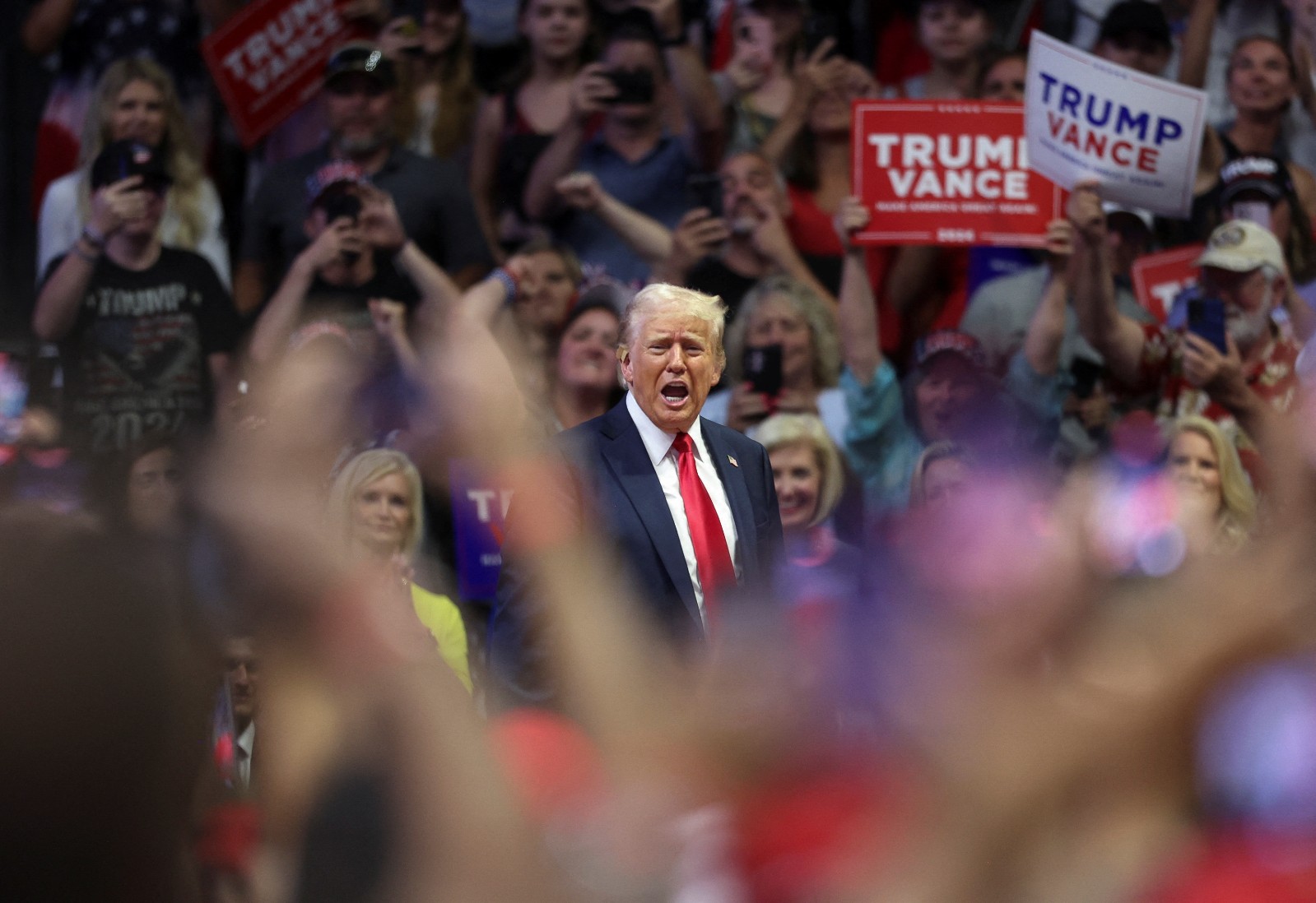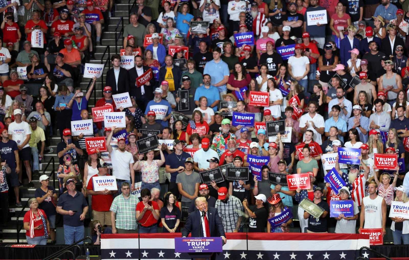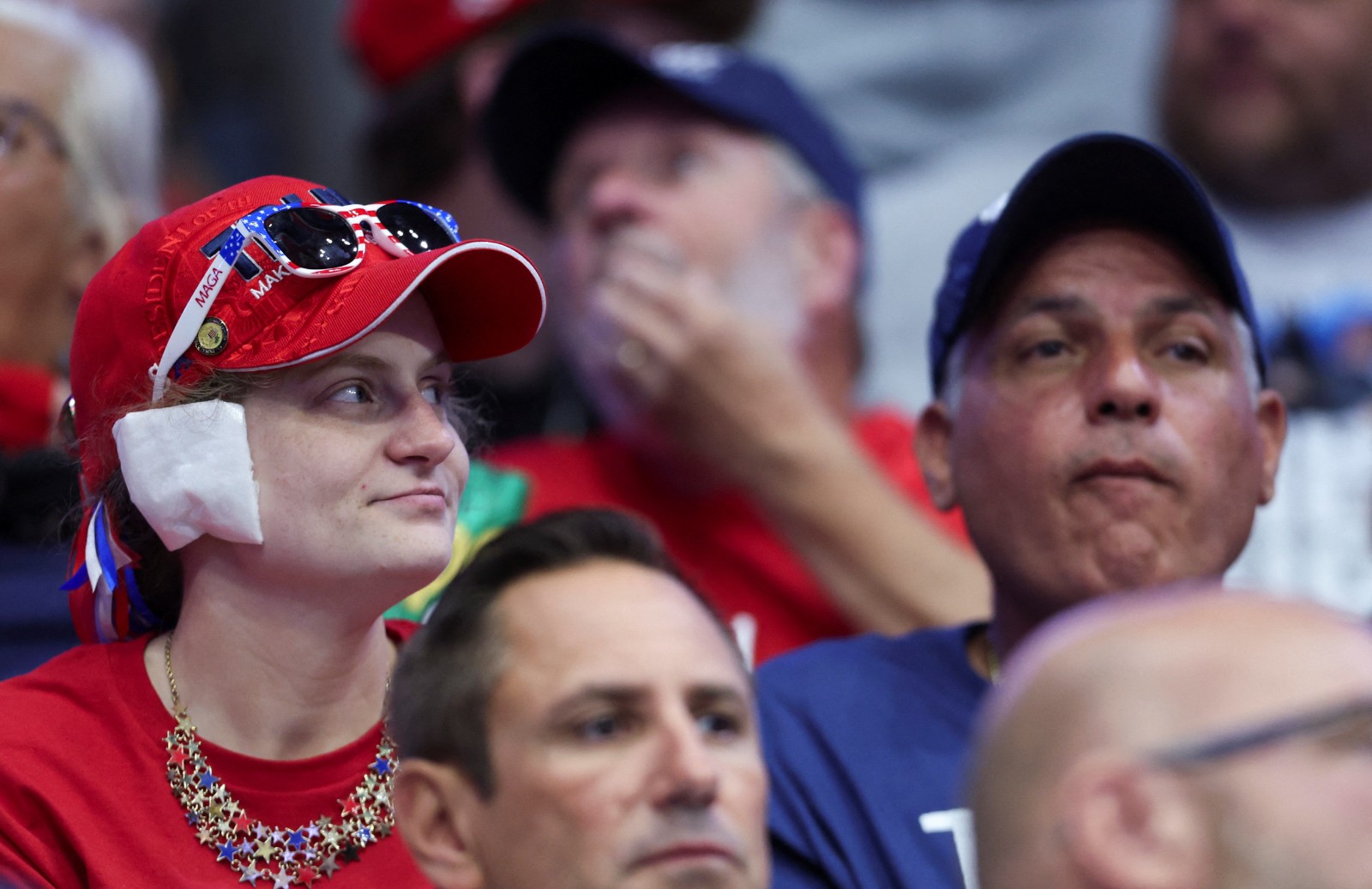 特朗普當晚耳朵上戴着一個較小的米色繃帶,這是他遭槍擊來首次出席競選集會。此前在密爾沃基舉行的共和黨全國代表大會上,特朗普一直在耳朵上戴了一塊更大的白色繃帶,並引發了人群的模仿。