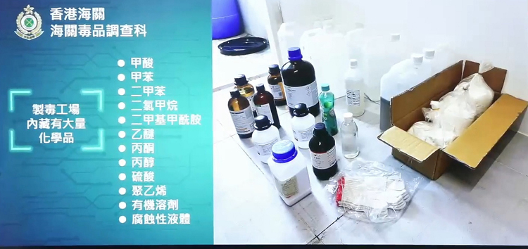 海關毒品調查科毒品調查第一組高級調查主任張廣達今日(22日)表示,昨日(21日)人員在大角咀進行反毒品行動,截查一名目標男子,將他帶到附近一個商業大廈單位進行搜查,並在單位內發現有大量化學品,包括甲酸、甲苯、二甲苯、二氯甲烷、二甲基甲醯胺、乙醚、丙酮、丙醇、硫酸、聚乙烯、有機溶劑和腐蝕性液體等,當中甲苯、乙醚、丙酮和硫酸4種是化學品管制條例下附表三所列明的受管制化學品,相信該批化學品用作製造搖頭丸。