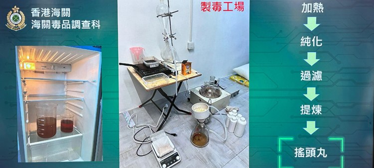海關破獲搖頭丸製毒工場,為過去20年來首次搗破。昨日(21日)在大角咀拘捕一名19歲男子,他以「一條龍」式自行製毒和銷售,檢獲大批受管制和具高度危險性的化學物品,以及約4.5公斤搖頭丸,市值約110萬元。