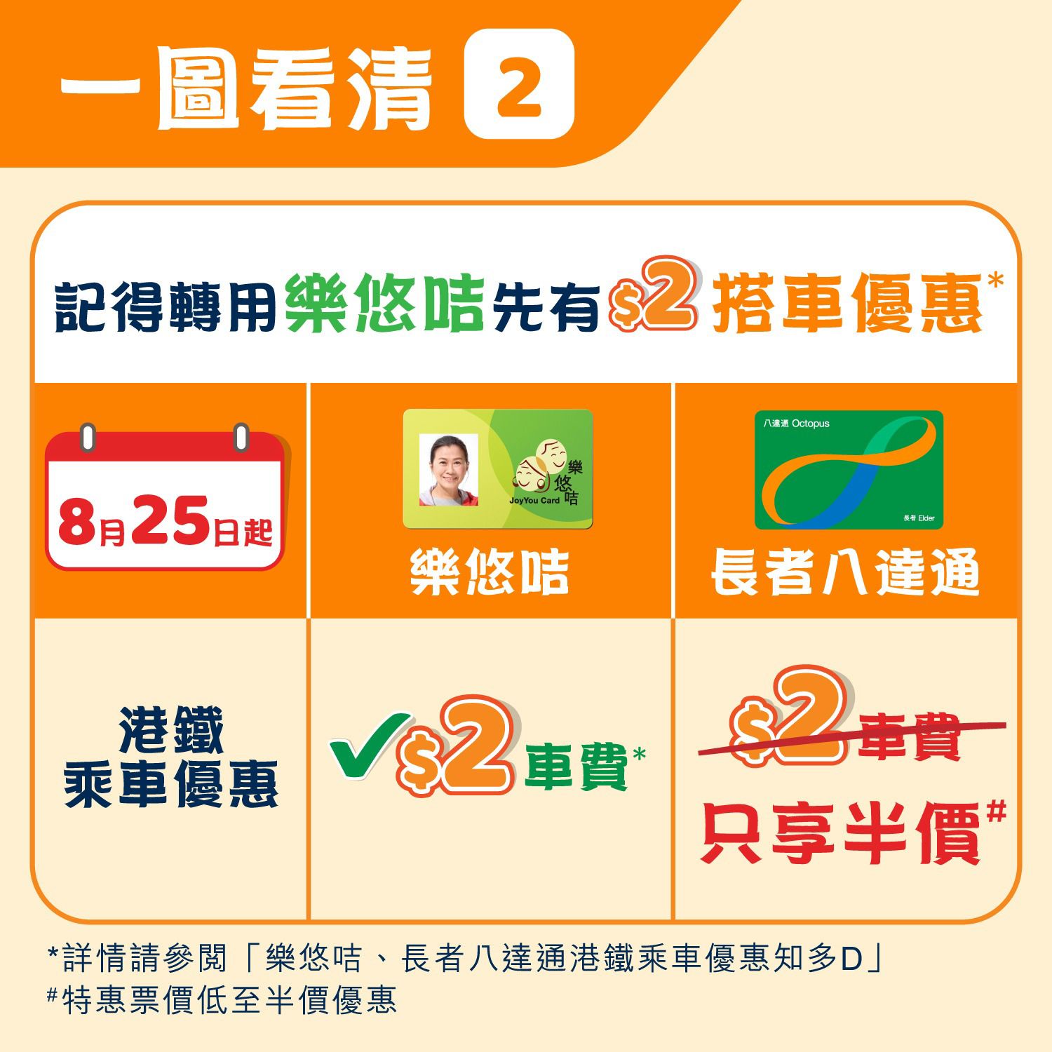 港鐵今日(26日)表示,政府長者及合資格殘疾人士公共交通票價優惠計劃(「二元優惠計劃」)將於今年8月25日起實施新安排,所有60歲或以上香港居民必須使用「樂悠咭」才能享用2元優惠計劃。