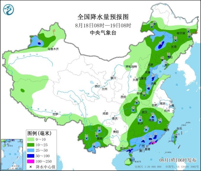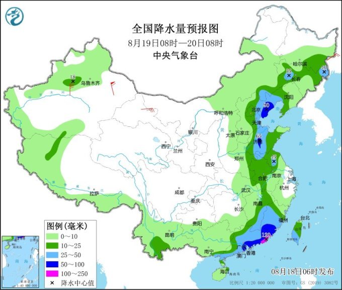 氣象監測顯示,昨日(17日),華北大部、內蒙古中部、陝西、河南北部以及江南、華南等地出現分散性大到暴雨、局地大暴雨,河北邢臺清河縣(112.6毫米)、河南鄭州中原區(112.2毫米)局地最大小時雨量超過100毫米。預計今天白天至夜間,北方雨帶略有東移,天津、河北、山東、河南、內蒙古東部及東北部分地區有中到大雨、局地暴雨;廣東地區是南方的強降雨中心,廣東東南部沿海等地部分地區有大暴雨(100~120毫米);此外,新疆伊犁河谷有大到暴雨。中央氣象台18日早晨繼續發布暴雨藍色預警。