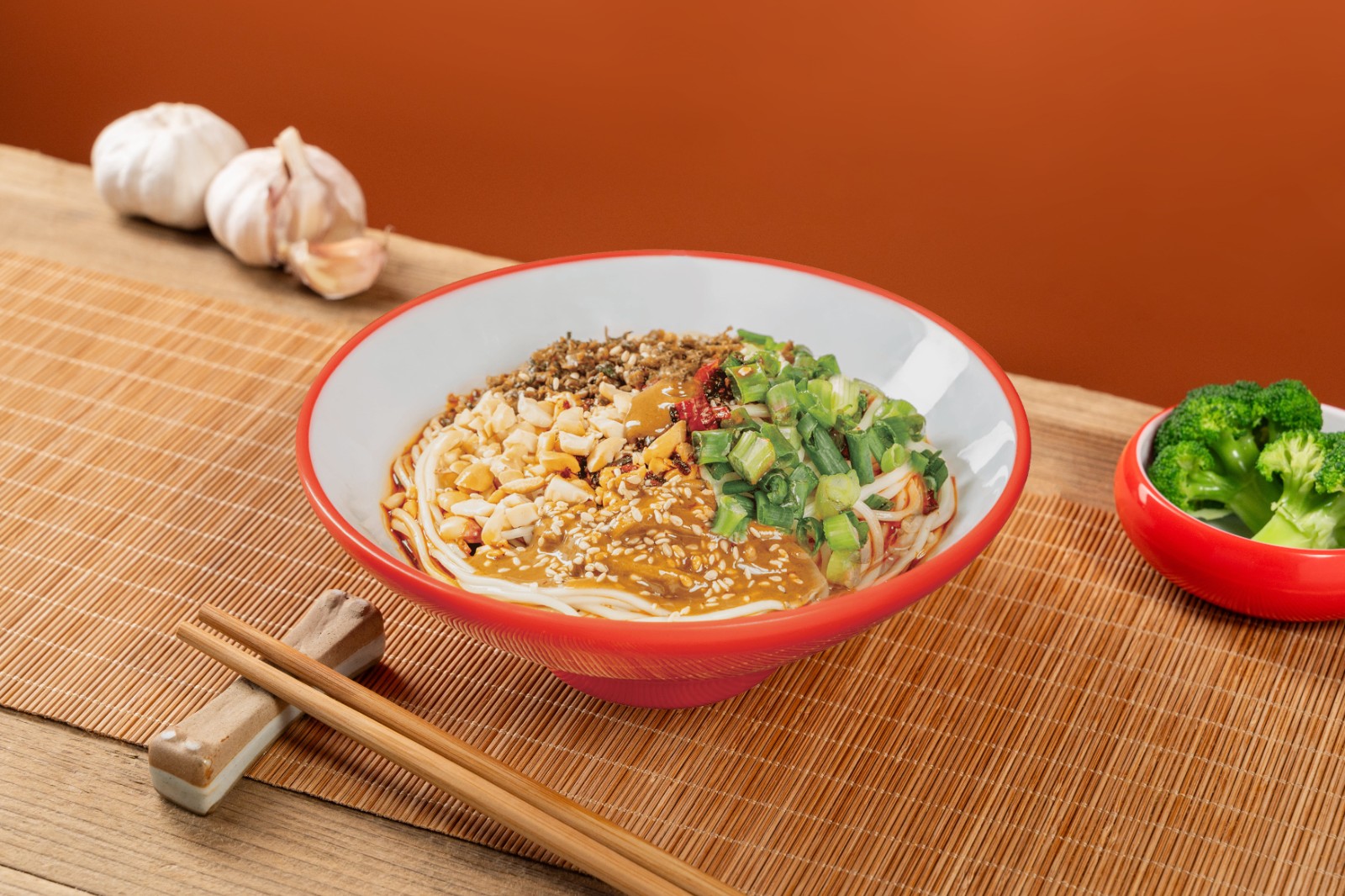 擔擔麵是重慶特產小吃,得名於挑擔叫賣的傳統。 其麵條細滑,主要以九園油辣子、花椒麵、芽菜、 芝麻醬等為佐料,鹹鮮過癮,醬香濃厚。