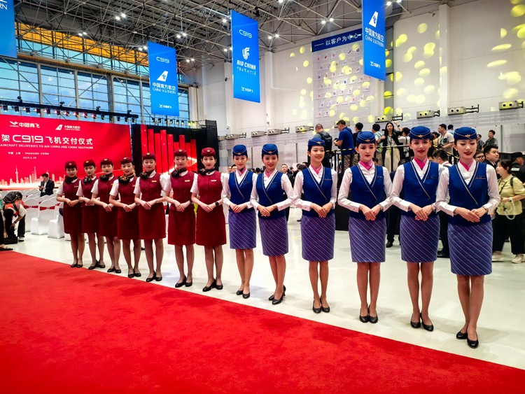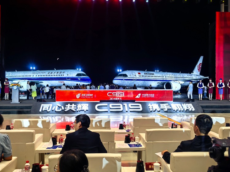 當天的活動現場,隨着機庫大門緩緩拉開,噴塗着五星紅旗的國航C919首架機與紅色木棉花塗裝的南航C919首架機同台亮相、交相輝映。中國商飛向國航、南航頒發《飛機銷售證》並移交飛機交付紀念鑰匙,中國民航局向國航、南航頒發《國籍登記證》《單機適航證》和《無線電台執照》。國航C919首架機為延程型,採用158座兩艙布局,包含8個公務艙和150個經濟艙。南航C919首架機為標準航程型,採用164座三艙布局,包含8個公務艙、18個明珠經濟艙和138個經濟艙。兩架飛機均裝配了定製化的客艙座椅等設施設備,全艙配置個人充電接口,為乘客提供便捷舒適的乘機體驗。