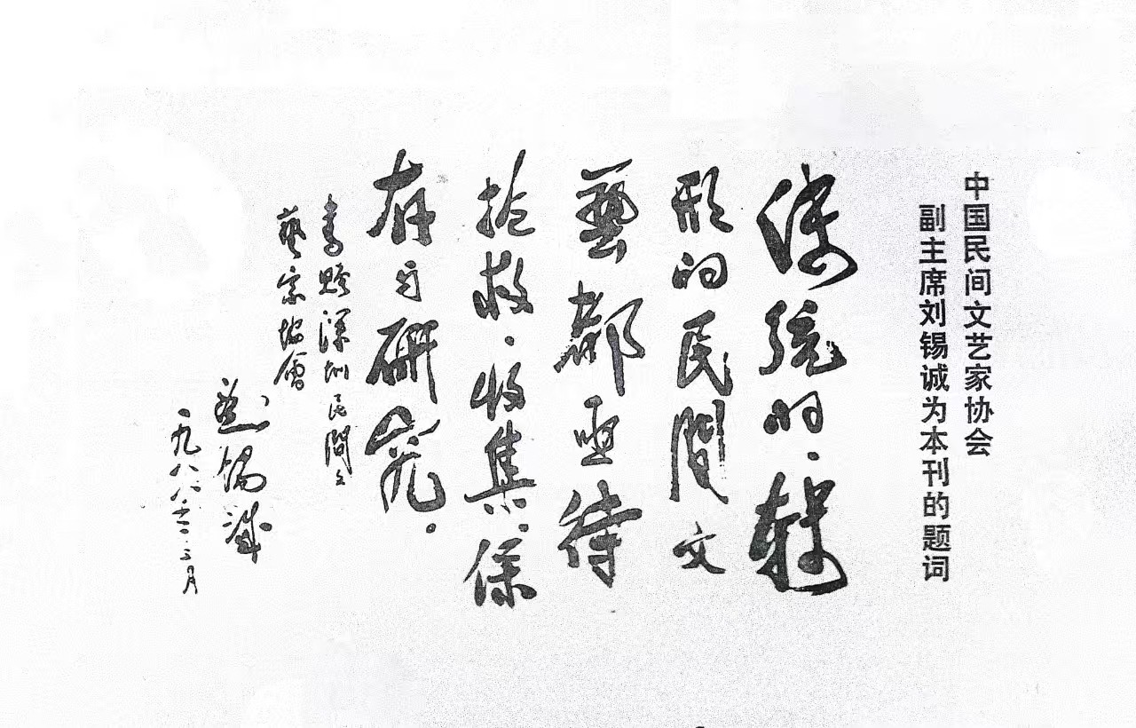 這次會議結束後,由劉錫誠先生主編的《民間文學論壇》刊載了包括拙文在內的相關文章。而劉錫誠先生指出:「大家對特區正在發展變化的民間文化很感興趣。目前,民間文化(文學)界面臨兩個問題,一是傳統民間文化如何挖掘保護和傳播的問題,二是民間文化如何隨着經濟的發展而發生變化的問題。第一個是民族傳統文化的命運問題,目前全世界對這個問題極為關心,特別是工業化的國家更為關注;第二個是民族傳統文化發展變化的問題,目前我國不少地方,已出現民族文化中西融合的傾向」。他在給《深圳民間文藝》題詞時也指出:「傳統的、轉型的民間文藝都亟待搶救、收集、保存與研究。」(見《深圳民間文藝》1988年第2期)這些都充分表明,錫誠先生主張應該搶救、收集、保存與研究「傳統的、轉型的民間文藝」,實則是提出了新時期如何繼承、創新發展中國民間文化(文學)的重要命題。