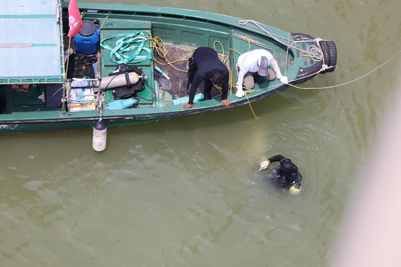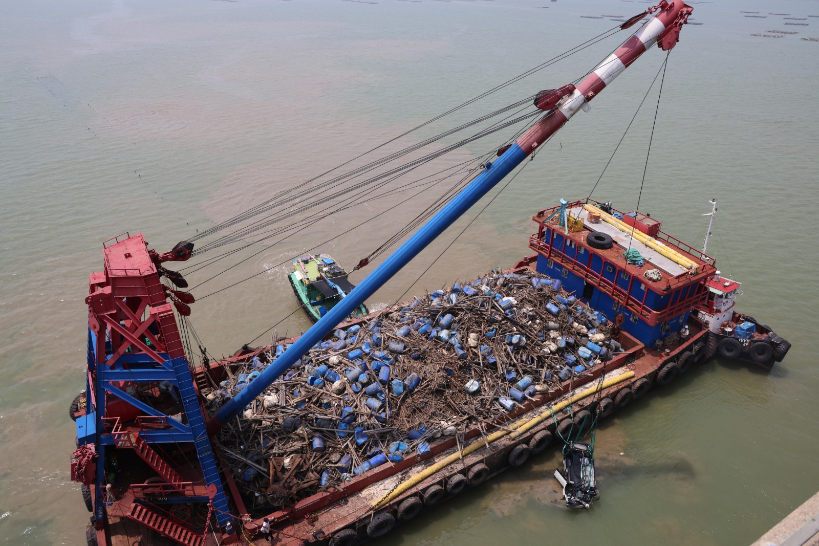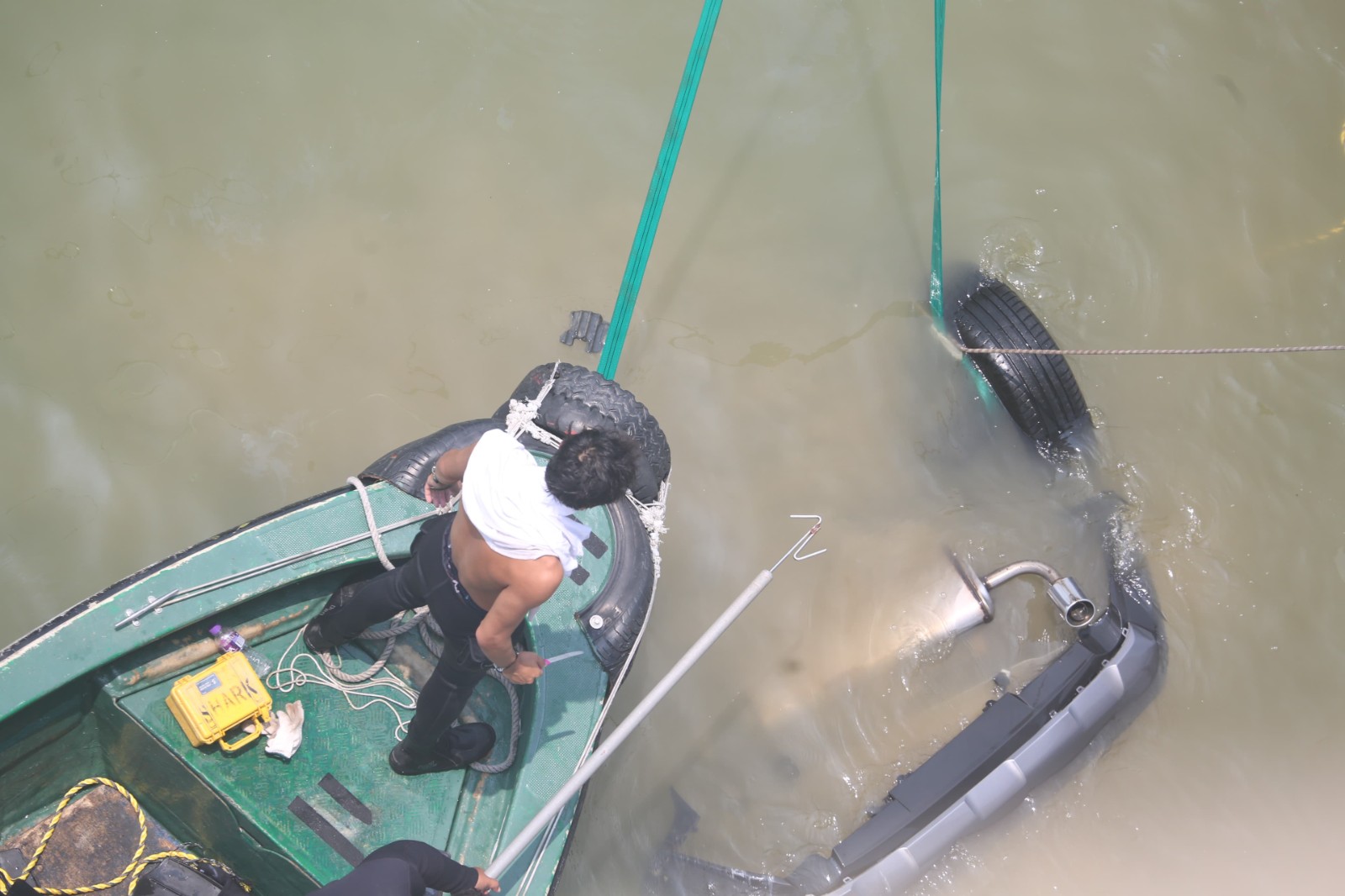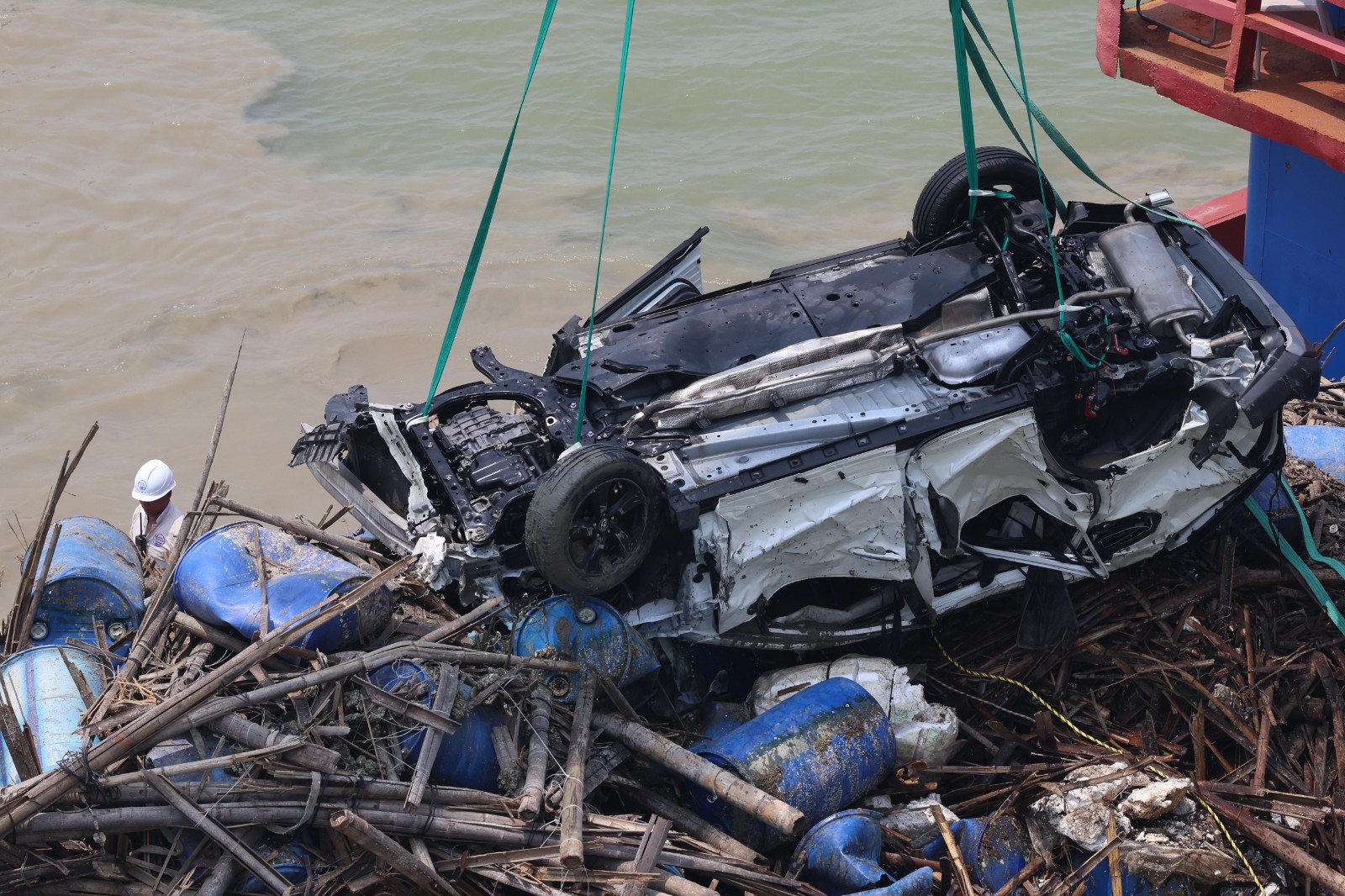 一名海關關員昨晚(2日)駕車上班途中在深圳灣大橋懷疑失控,連人帶車飛越橋邊欄杆墮海,消防蛙人救出傷者送院搶救,最終救治無效死亡。警方今早(3日)9時許安排躉船到場打撈肇事私家車,但因退潮現場海面水深不足,延至中午12時躉船駛近事發海面,蛙人落海綁緊私家車固定後,將車吊上躉船。