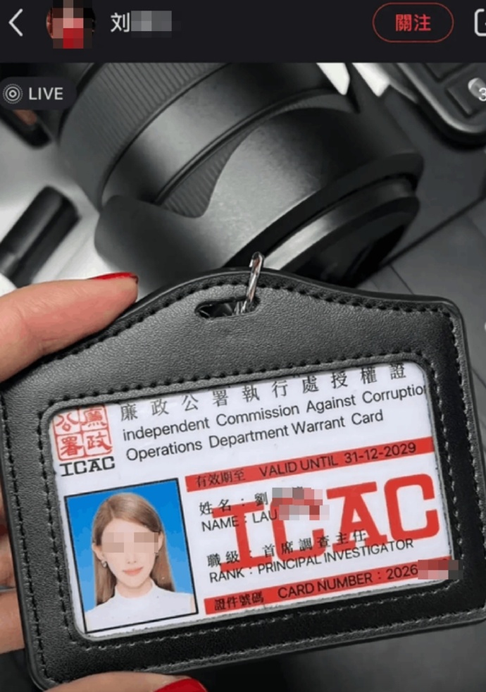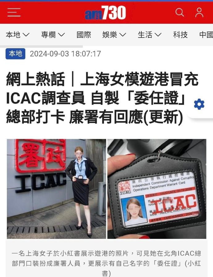 近日,一名上海女遊客在社交平台曬照,照片顯示,她在北角ICAC總部門口裝扮成廉署人員並展示有自己名字的「委任證」,職級為「首席調查主任」。針對此事,廉署接受港媒am730查詢時表示,帖文涉及的人士並非廉署人員,提醒根據ICAC第13C條,冒充廉署人員即屬犯罪 ,一經定罪,最高可被判處監禁一年及罰款25000元。