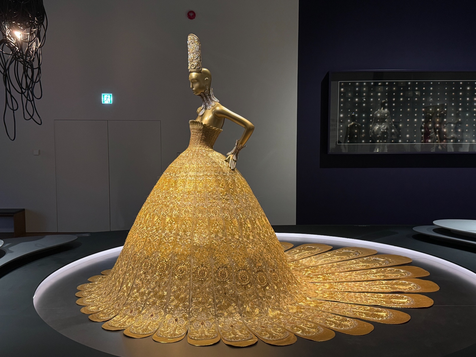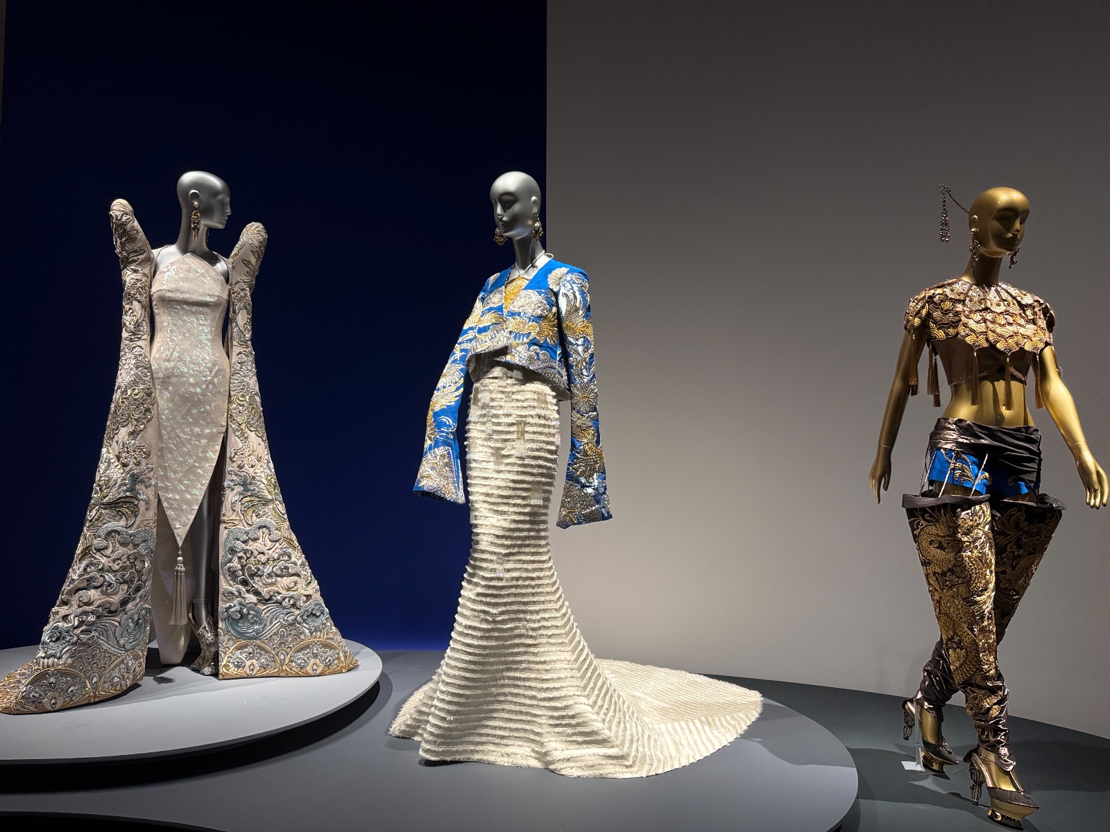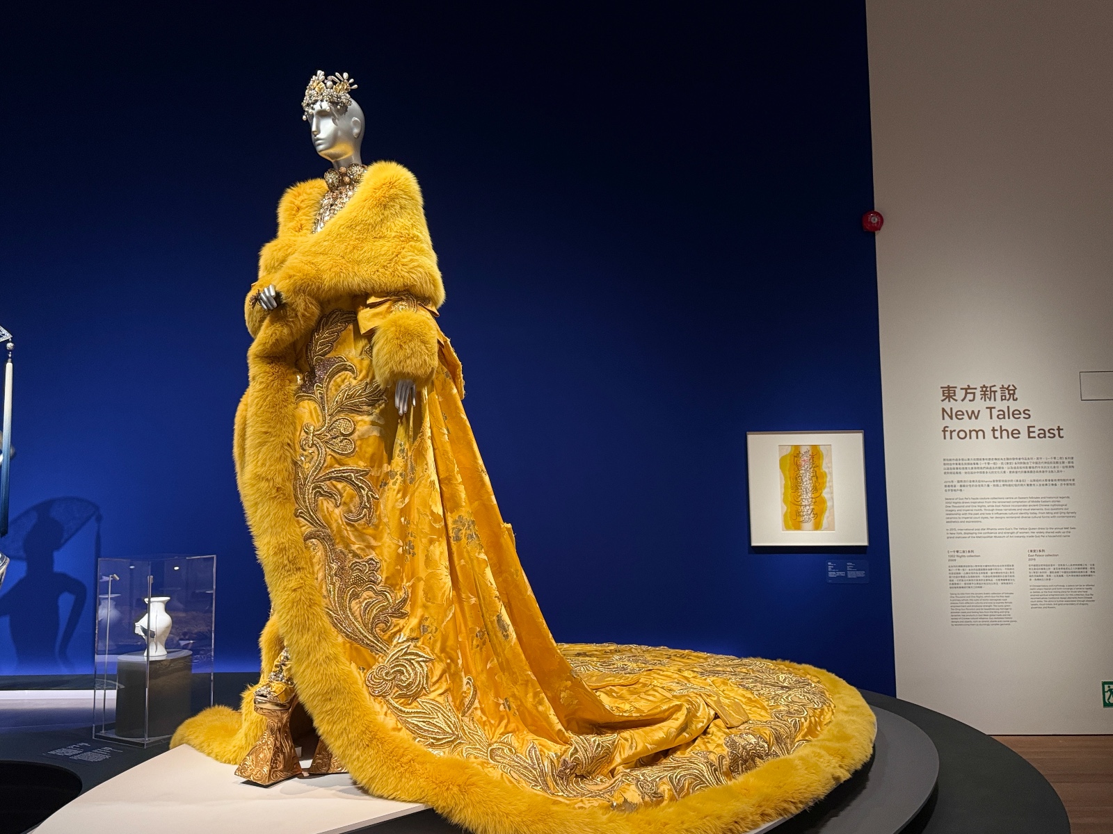 「東方新說」展區呈現了《一千零二夜》(2009)和《東宮》(2019)系列。談到郭培,很多人都會聯想到她那件讓全球矚目的《黃皇后》(一千零二夜系列)禮服。這件作品曾由美國歌手Rihanna在2015年Met Gala慈善晚宴上穿着,點燃了全世界的關注。重達25公斤,袍長四米的《黃皇后》不僅僅是一件時裝,更展示了女性的自信與力量。《一千零二夜》系列靈感源自經典的《一千零一夜》故事集,這個系列充滿了中東與亞洲文化的交融。郭培通過複雜的刺繡、珠飾和奢華的面料,展現了神秘而迷人的東方世界。每一件禮服都像是從古老的故事中走出來的,帶着濃郁的異域風情,講述了關於勇氣、智慧與愛情的故事,將古老的東方神話與現代時尚結合。作品中充滿了奇幻色彩,充實了視覺上的戲劇性,令觀眾恍如置身於那個充滿傳奇的故事世界。