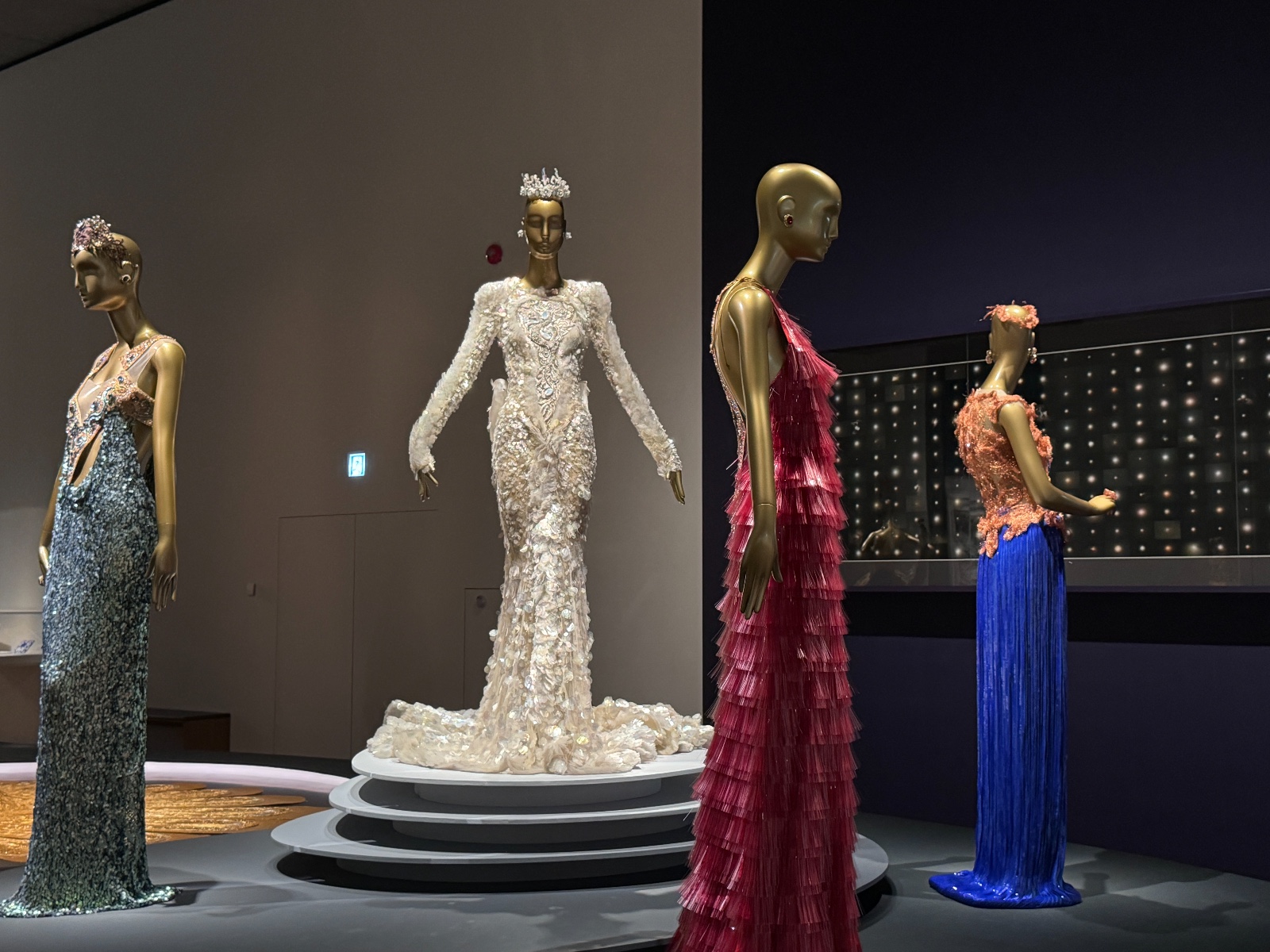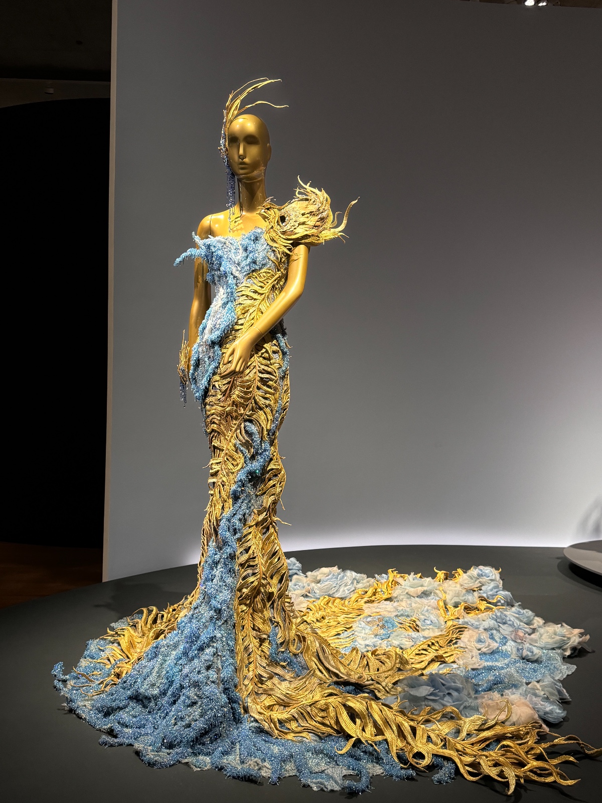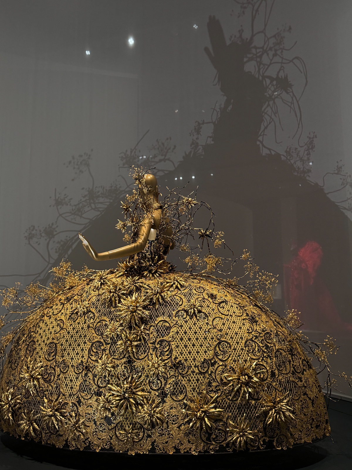 在「夢與現實」主題中,郭培通過《輪迴》(2006)和《遇見》(2016)兩個系列作品,探討了時間、空間和生命的永恆輪迴。《輪迴》系列中的一件作品《大金》(2006),是郭培的首件高級定製傑作,展現了她對古典美學與現代設計的融合。這件禮服以金色為主調,象徵着永恆和生命的迴圈,複雜的刺繡和層層疊疊的裙襬好像在述說着時間的流逝與生命的延續。《遇見》(2016)系列中,郭培則更大膽地使用了非傳統面料和強烈的色彩對比,表達了她對因果關係的獨特理解。(部分圖片、記者:Katherine)