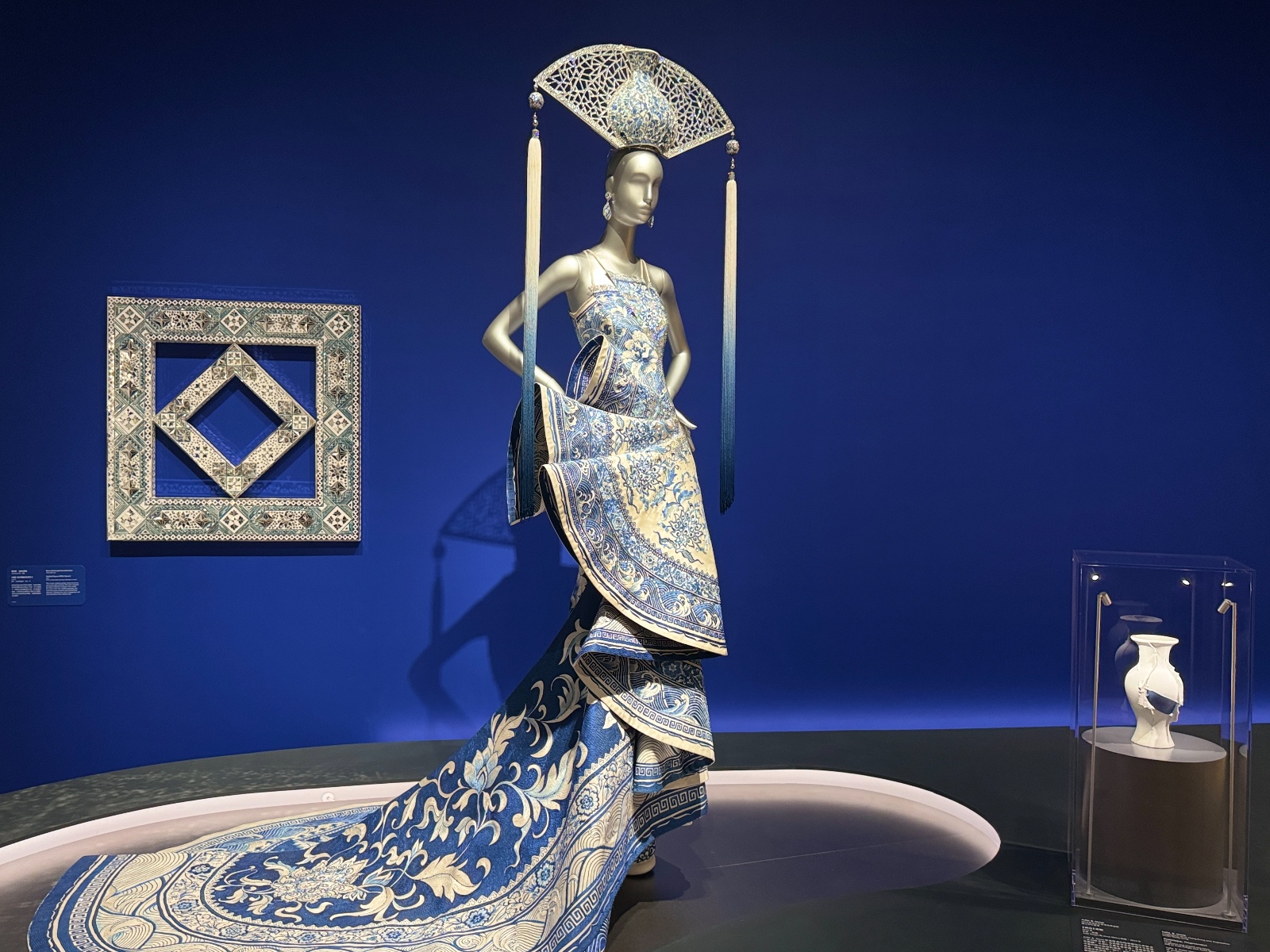 《青花瓷》出自《一千零二夜》系列,這件作品的靈感來自中國傳統青花瓷禮服上的祥雲紋、水紋和蓮花紋等圖案,均以手繪面料結合手工刺繡展現出來。裙身的多層褶邊,營造出雕塑般的立體感,遠看似由青花瓷片組成。頭飾則形似一把傳統中式摺扇,扇面正中為花瓶結構,耗時近一萬小時製作完成。