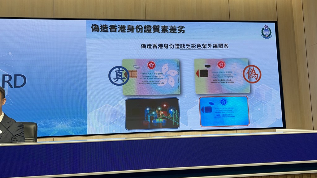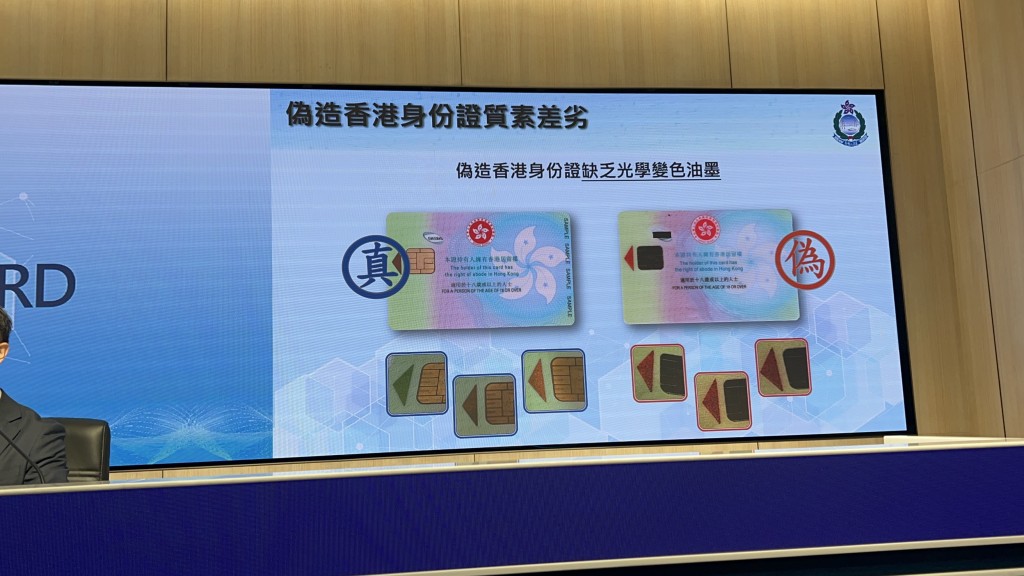 入境處提到,行動中所檢獲的全部假身份證質素差劣,欠缺防僞特徵,與真正的香港身份證比較,不難分辨。例如真正身份證相片側邊,會有三朵紫荊花全息圖像,假證則沒有;真正身份證背面在紫外線照射下,會顯示彩色維港及青馬大橋煙花圖,假證亦沒有;真正身份證背面有一個光學變色油墨印刷而成的三角形圖案,可以隨觀察角度轉變,由紅色變成綠色,假證同樣沒有。
