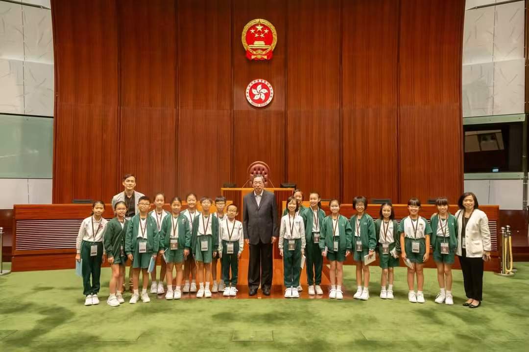 立法會主席梁君彥為2024/25學年「與立法會議員暢談」計劃揭開序幕,並親自接待17名來自九龍塘學校(小學部)的小五和小六學生。圖:梁君彥fb