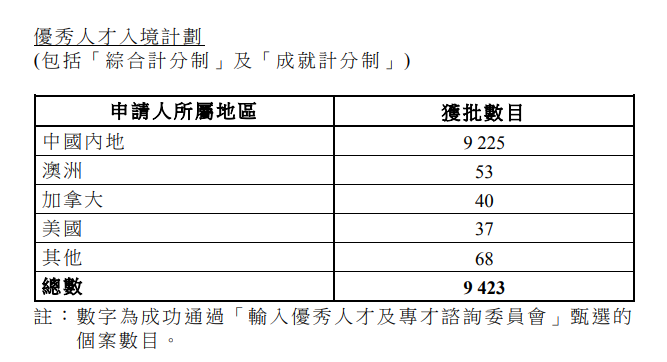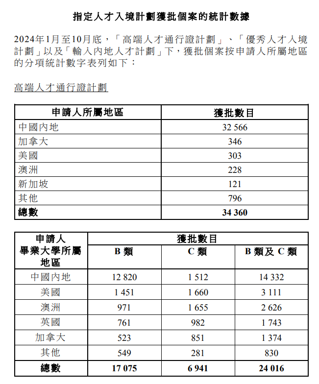 孫玉菡介紹,今年首10個月內,各項人才入境計劃共收到近18萬宗申請,近12萬宗獲批。當中,約7.5萬人已經到港,同時約7.5萬名受養人隨同獲批人才抵港。其中,高才通計劃、優才計劃以及輸入內地人才計劃下獲批個案分別為34360宗、9423宗及21296宗。