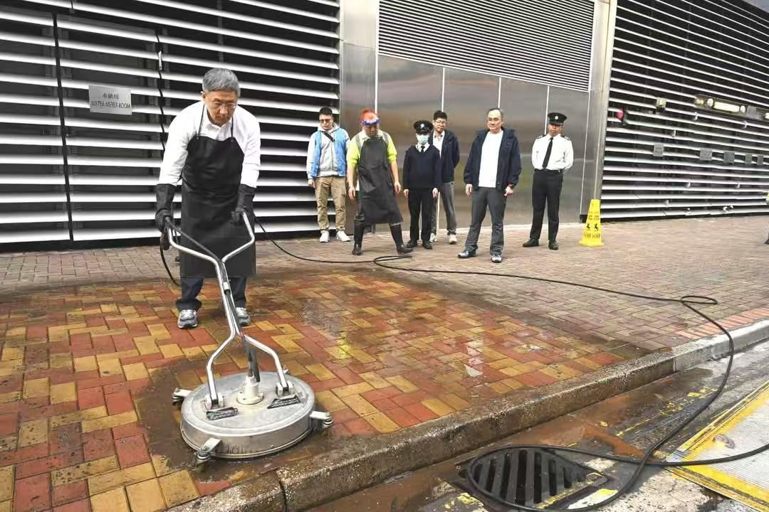 政務司副司長卓永興日前走訪港九新界多處地方,視察食環署使用高速清洗盤清洗街道的工作,指欣喜有關街道經改善衛生2年多後,仍能得以保持清潔。他要求食環署用心做好街道清潔,讓市民開開心心的過新年。