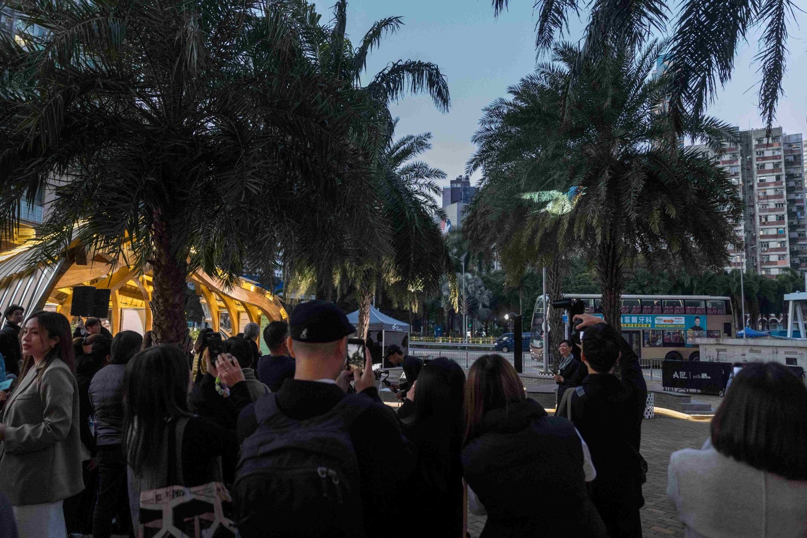 全息投影將於即日起至1月12日的晚上六點半至九點半於大角咀多個地點同步展出,包括奧海城2期露天廣場的「城市生活所」、「鐵樹街的轉角︰共創空間」,以及埃華街休憩花園。(攝影:Ruth、記者:Katherine)