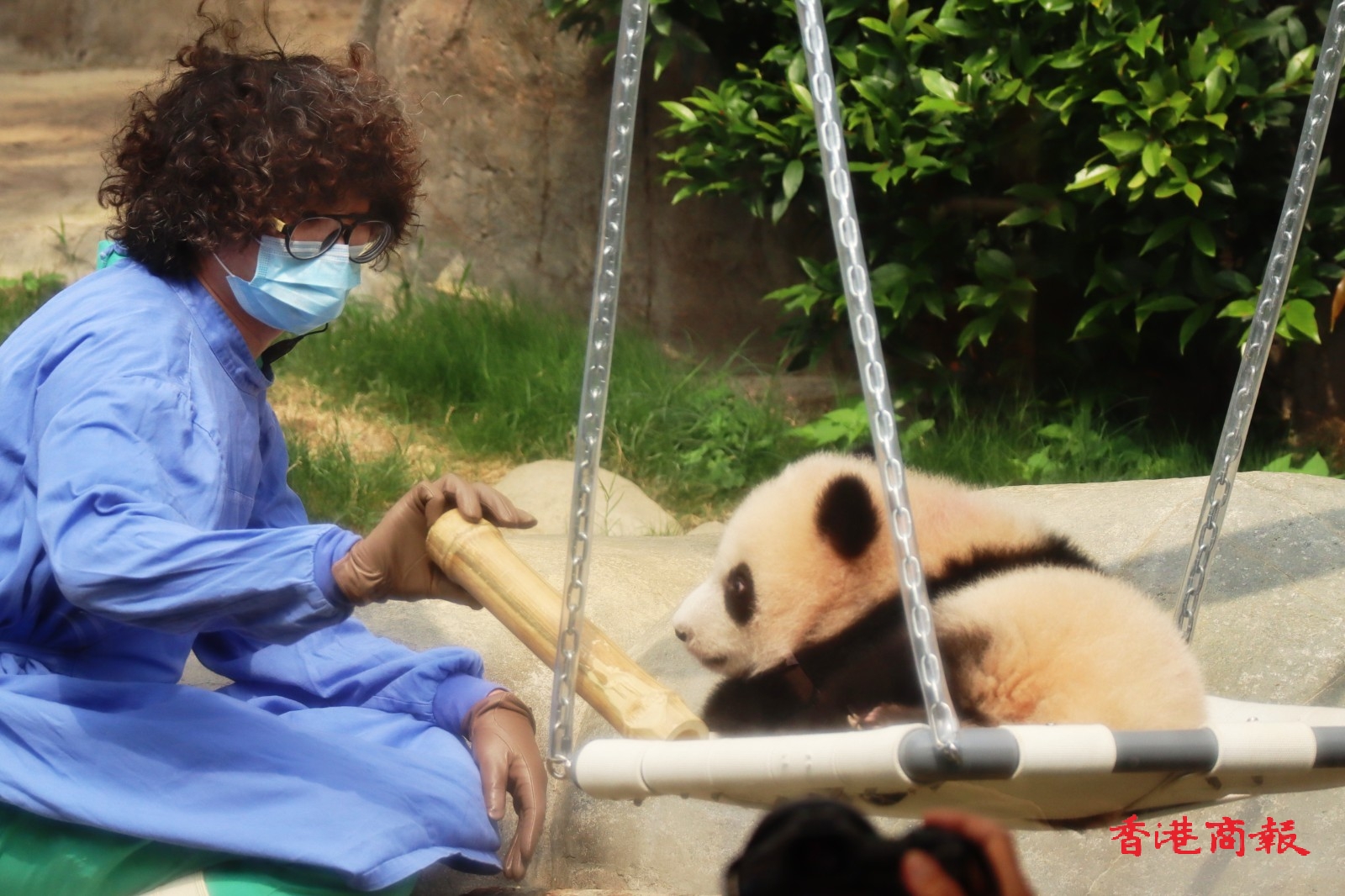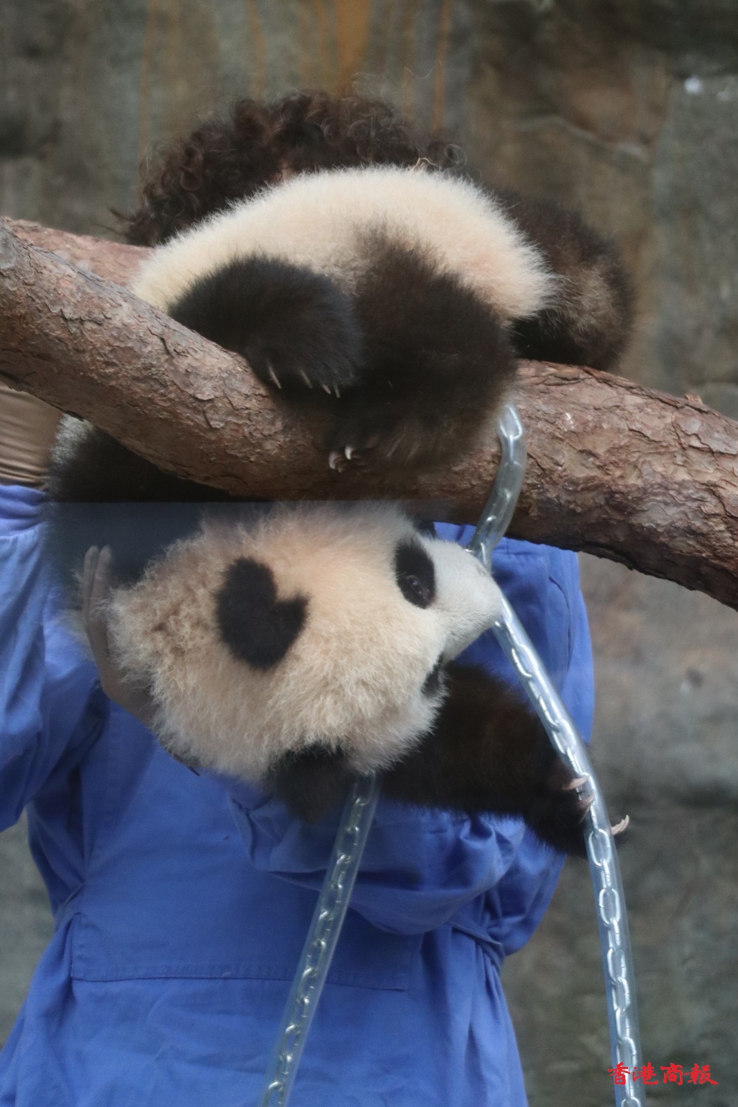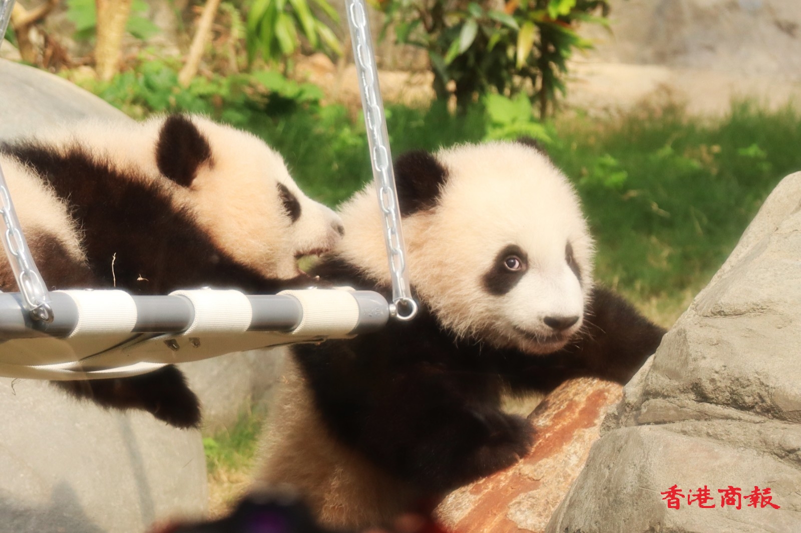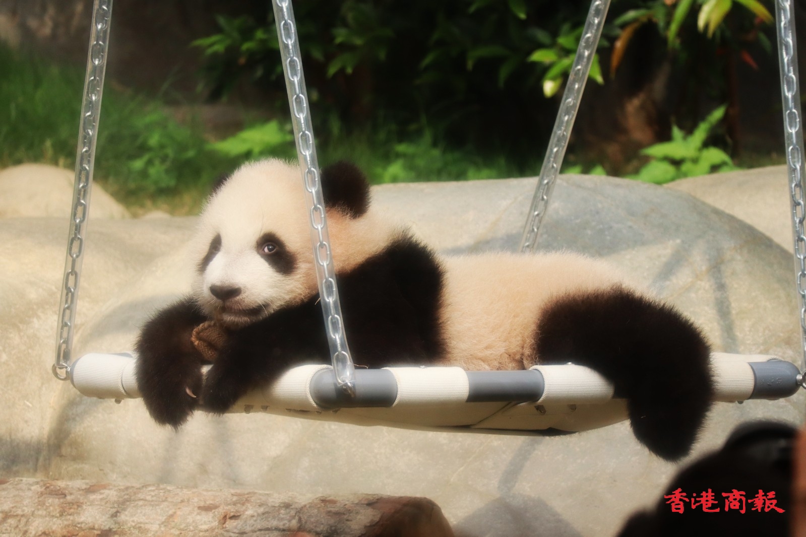 今日園方特別開放傳媒探訪環節,兩隻大熊貓寶寶十分可愛,「家姐」在滑梯翻滾,還用爪子撥弄懸掛的風鈴及枝葉,活力充沛。相較之下,「細佬」則安靜蜷縮在韆鞦上酣然入夢。(記者 馮瀚文 攝)