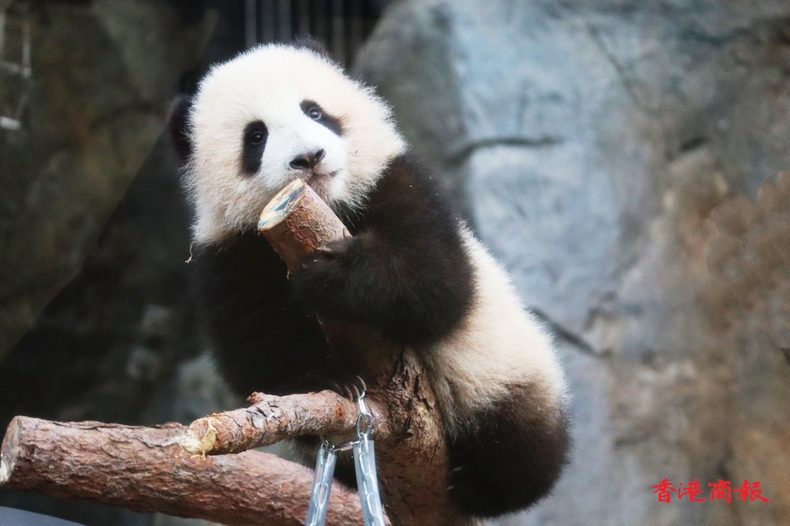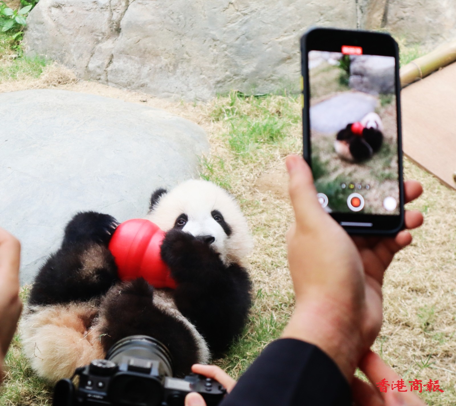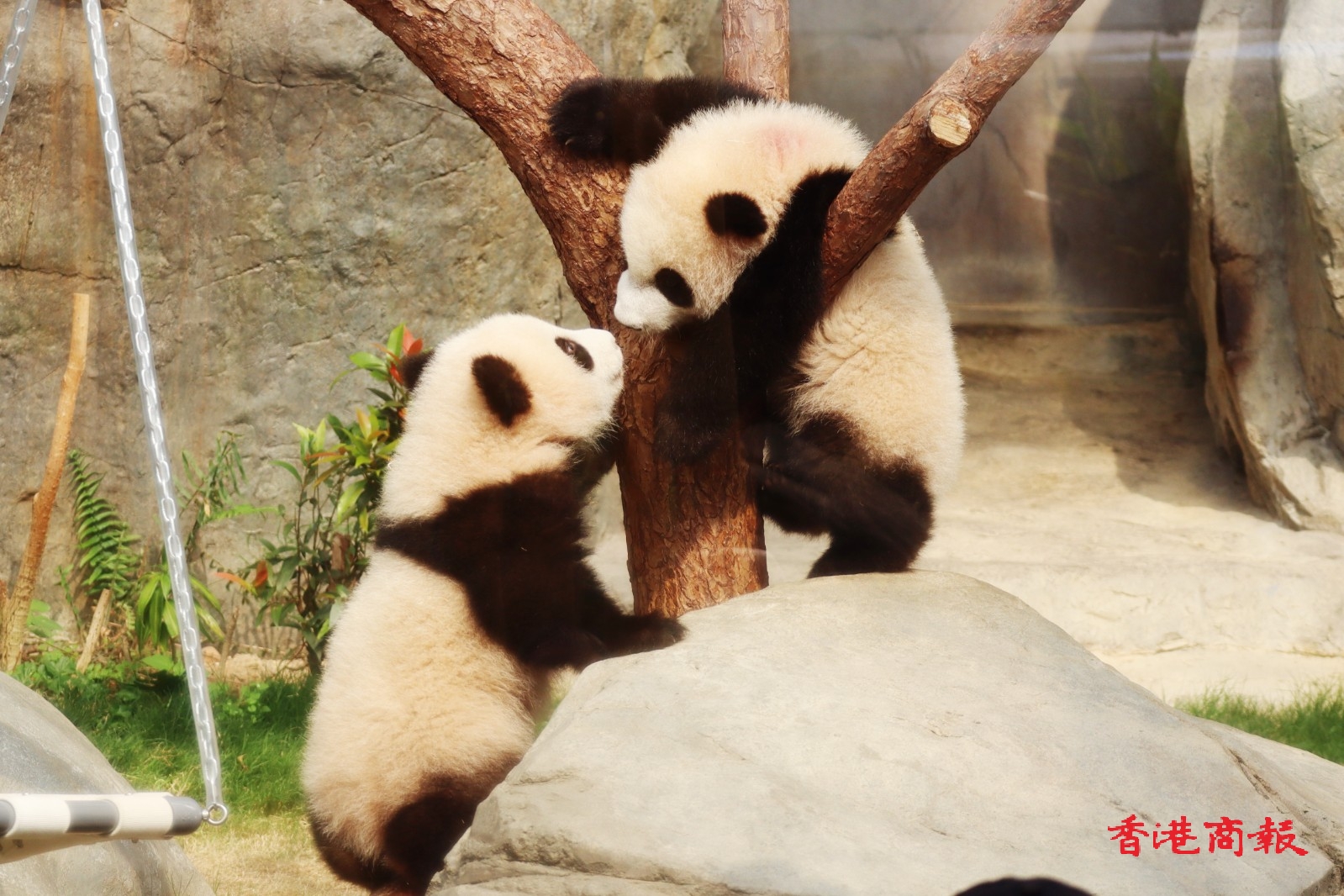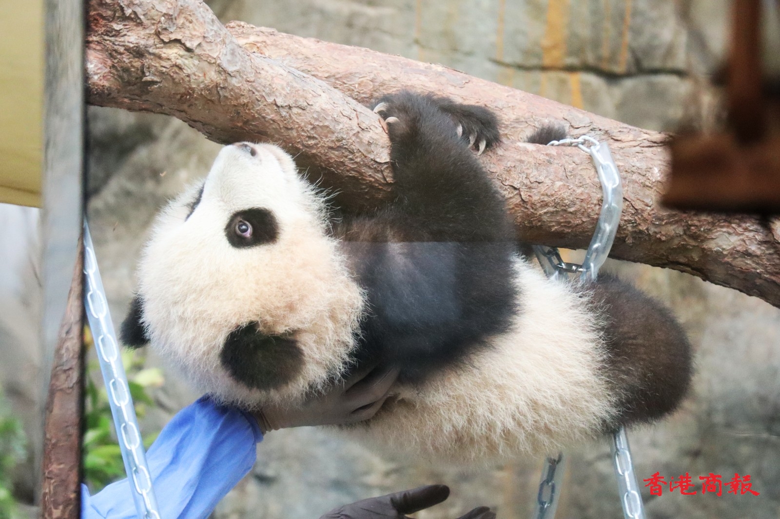 今日園方特別開放傳媒探訪環節,兩隻大熊貓寶寶十分可愛,「家姐」在滑梯翻滾,還用爪子撥弄懸掛的風鈴及枝葉,活力充沛。相較之下,「細佬」則安靜蜷縮在韆鞦上酣然入夢。(記者 馮瀚文 攝)